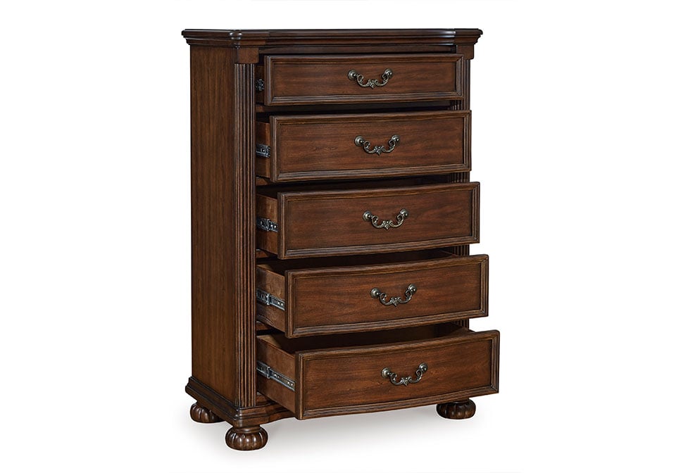 Take inspiration from the traditional luxury of this chest of drawers. Classic with a rich cherry brown finish, its stately presence graces your room with an air of opulence. Your taste for exquisite details is satisfied with decorative drawer pulls and chic bun feet. With five drawers acting as elegant hosts for clothes and other essentials, your restful retreat has never been so refined.