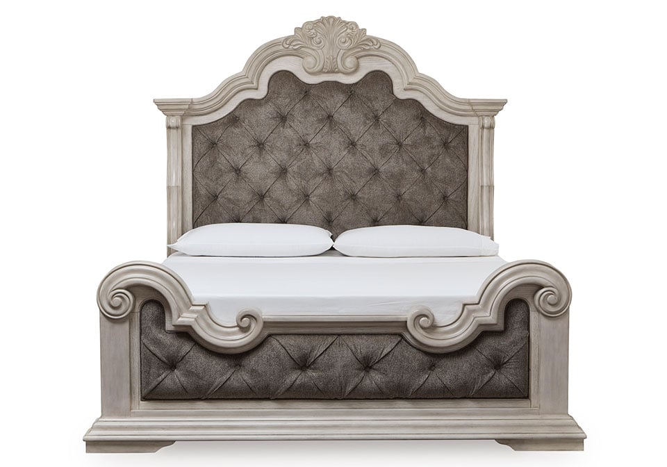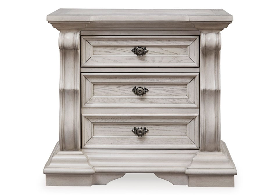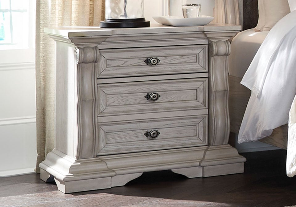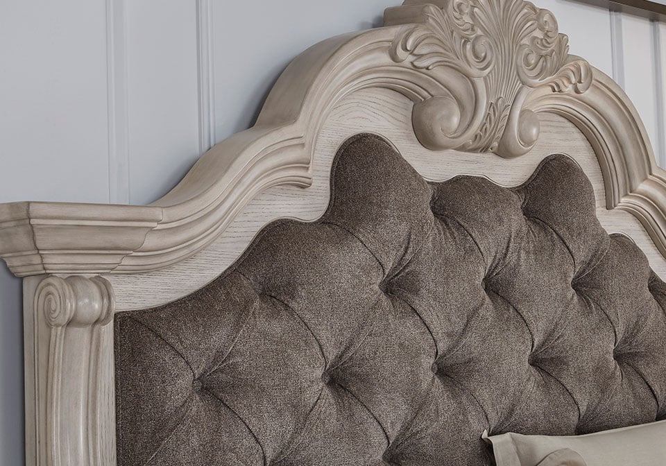 Inspired by the grandeur and grace of European traditional style, this opulent Series is nothing short of stunning. Its large-scale decorative scrolled pilasters, along with an ash swirl border and walnut inlay crowning the top, are sure to make a sophisticated statement in your restful retreat. A timeless antiqued white coloration and bronze-tone drawer pulls on case pieces lend an air of subtle elegance to this sumptuous piece.