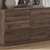 Made with MDF substrates and decorative paper laminate. Replicated walnut wood grain with high-low contrast for a rich brown wood tone. LED backlight feature with 3-way dimmer switch; operates from both sides of the bed. Case pieces with smooth-gliding drawers with English dovetail construction and center mount drawer guides. Drawer interiors lined with decorative wood grain paper laminate. Bed does not require additional foundation/box spring; accommodates most zero clearance adjustable bases.