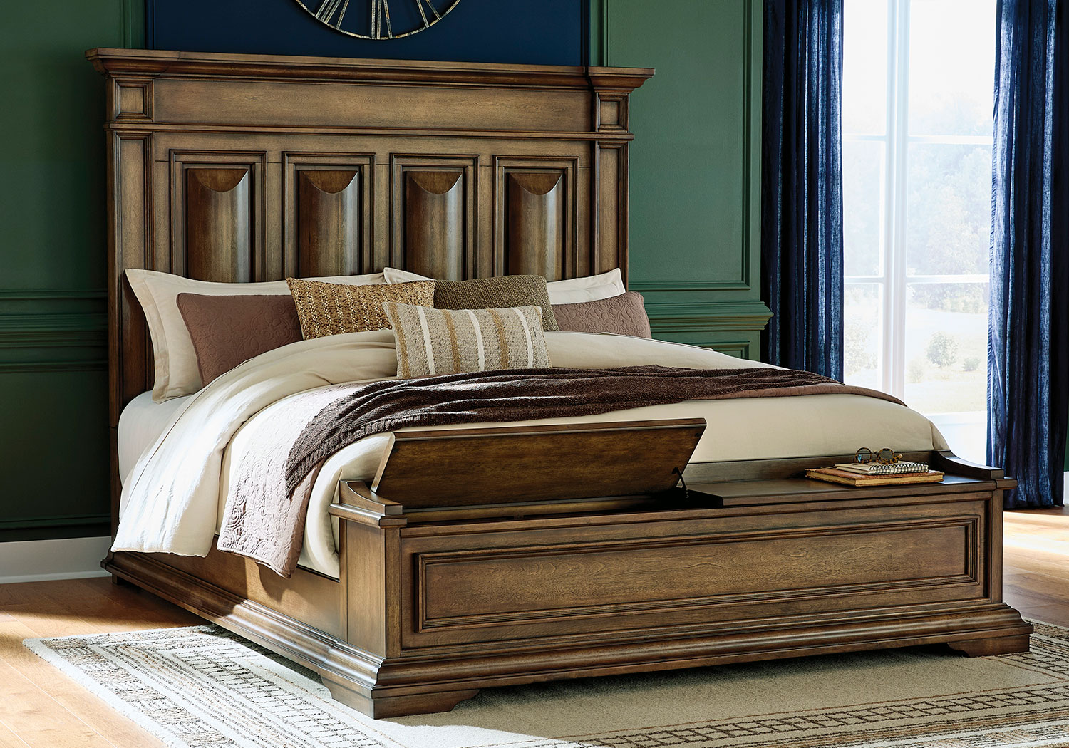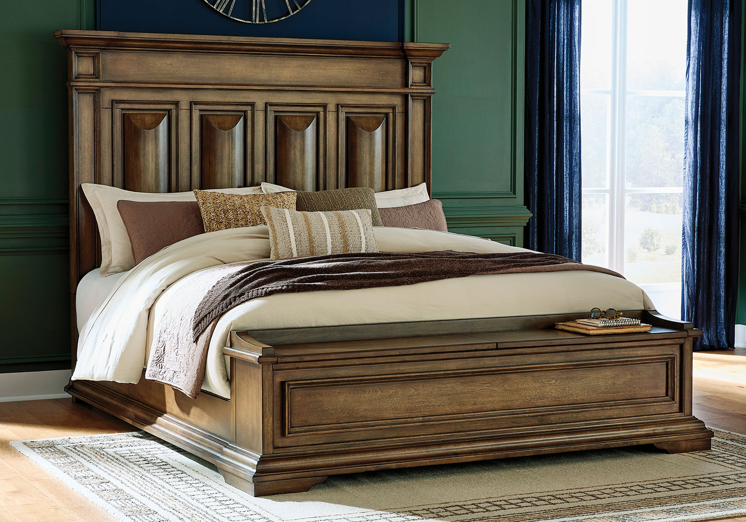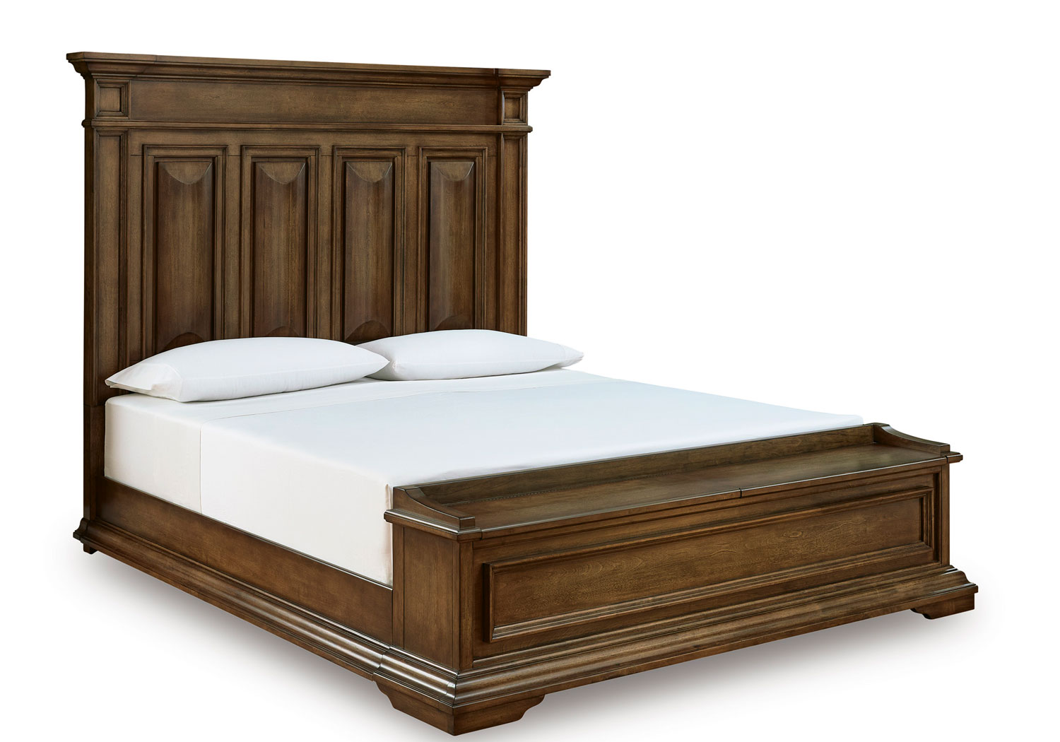 Time-honored style, made for today’s home. This panel storage Series pays homage to traditional aesthetics, with a richly detailed finish incorporating a sense of stately elegance. Included storage in the bench-style footboard adds subtle function. A substantially-scaled headboard and moulding details round out the piece in graceful fashion.