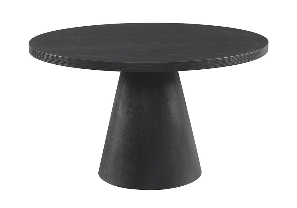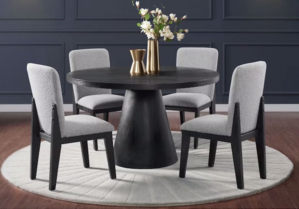 Elevate your dining experience with this Round Dining Series. Featuring a bold pedestal table in a rich black finish and four upholstered chairs in soft gray fabric, it blends modern sophistication with inviting comfort for any occasion.