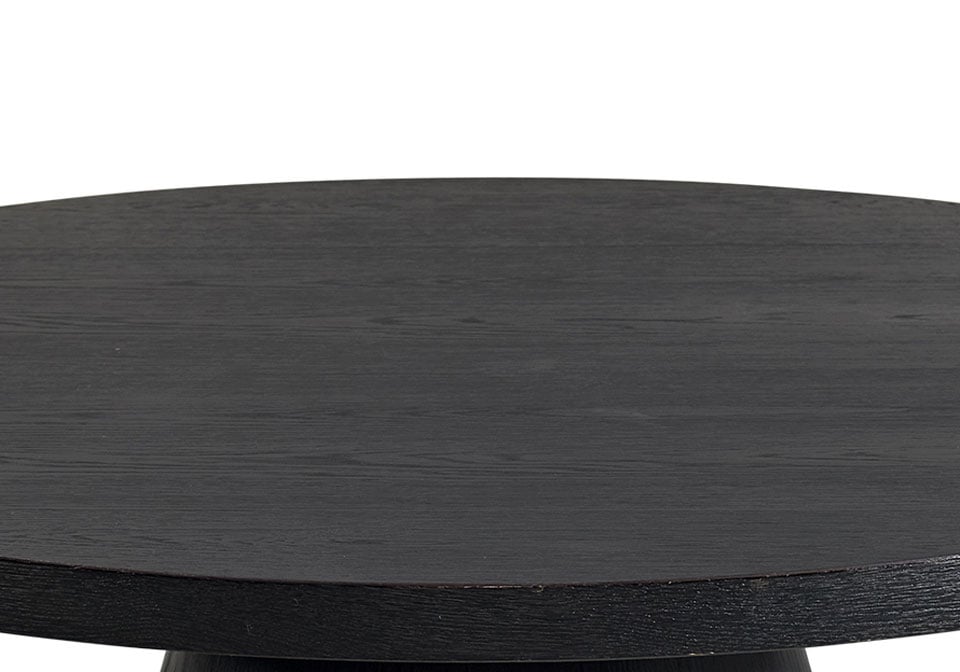 Sleek rectangular design. Refined black finish. Round tabletop & bold pedestal base. Airy, inviting style. Bold yet versatile presence. Perfect for gatherings.