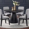 Experience the sleek sophistication of this Dining series. Crafted with grained oak veneer in a refined black finish. Its rounded edges and open pedestal base balance bold presence with inviting charm, creating a striking centerpiece for any gathering.