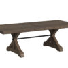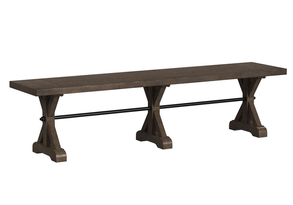 Warm textured finish. Timeless craftsmanship. Sturdy trestle base. Reinforcing metal bar. Broad dining surface. Two 12″ extension leaves. Versatile length options. Featuring two Host Chairs & Elegant Bench. Farmhouse-inspired style. Perfect for everyday meals or special occasions.