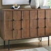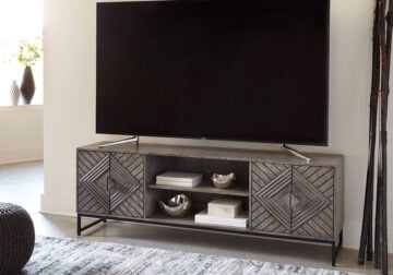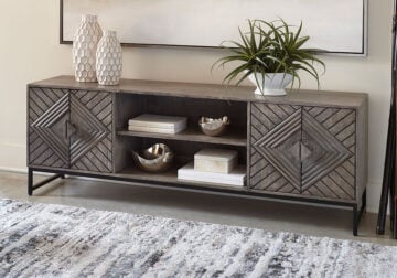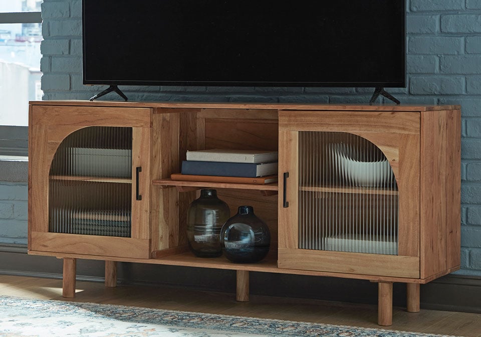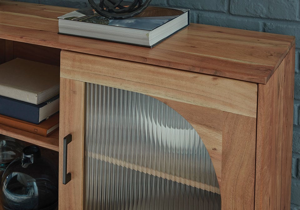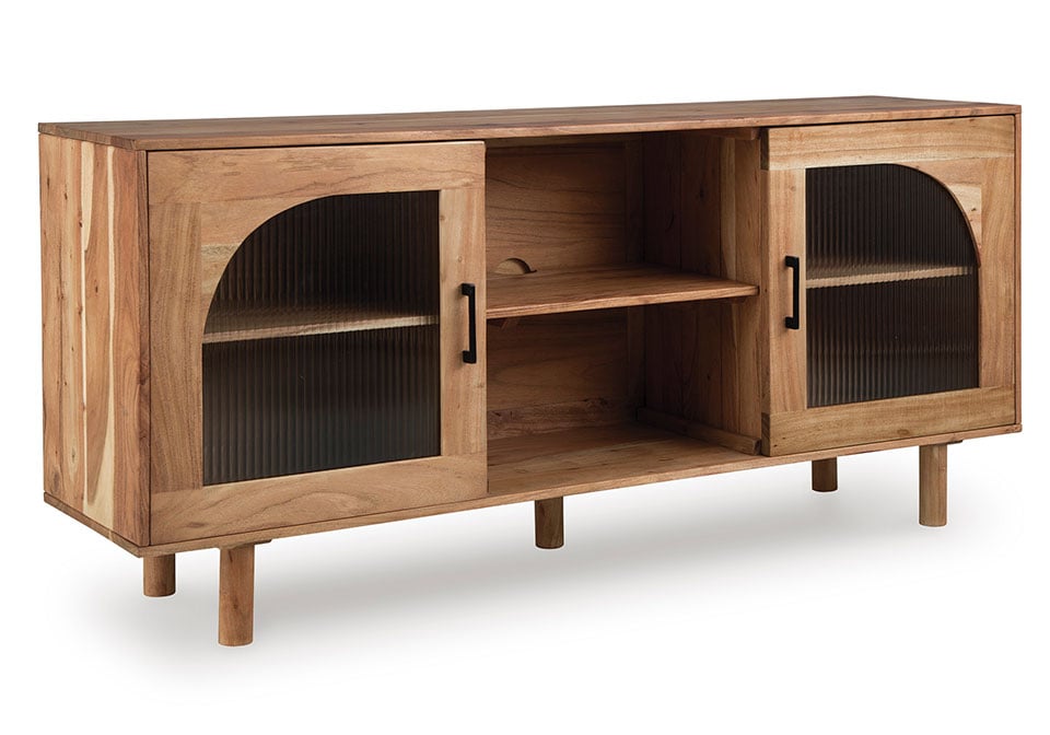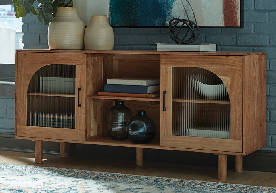 Simply chic storage awaits with this accent cabinet. With the versatility to act as a classic sideboard or a trendy TV stand, it’s at home in settings ranging from casual to modern. Doors with curved half-arch glass inserts soften the clean-lined look, while the removable shelves inside give you that much more flexibility. Openings in the back for electronics keep cables neatly organized, and the open middle shelving acts as a perfect host for media consoles.