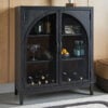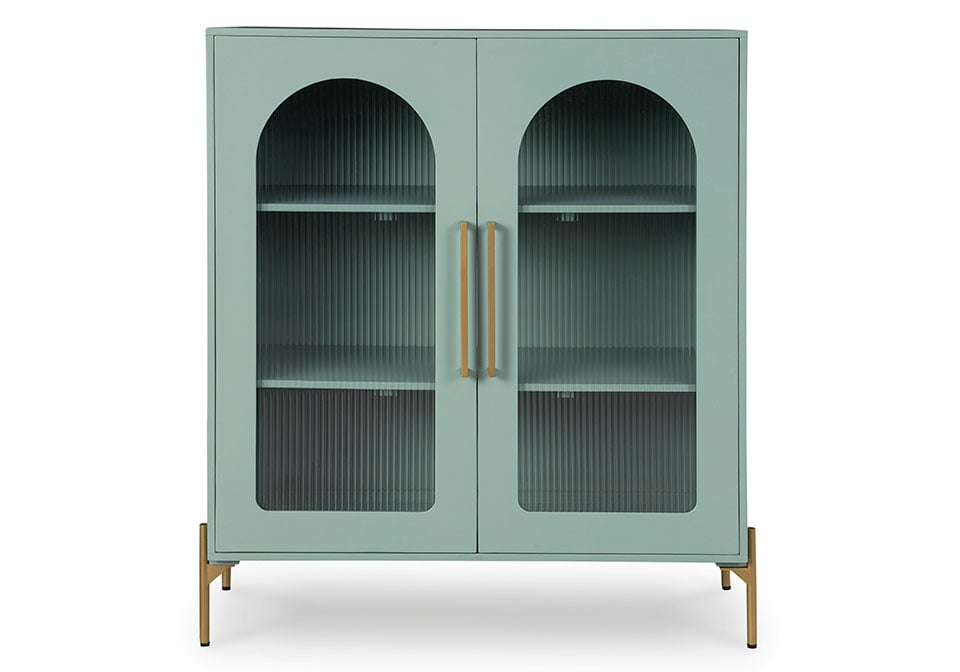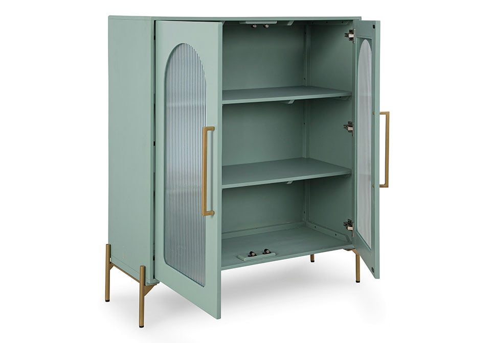 Clearly a stunning statement piece for lovers of contemporary design, this sleek accent cabinet wows on many levels. Magnificent arched fluted glass door panels and goldtone metal hardware exude serious modern flair. And how about that fresh green finish? Two shelves add practicality to the cabinet’s striking style.