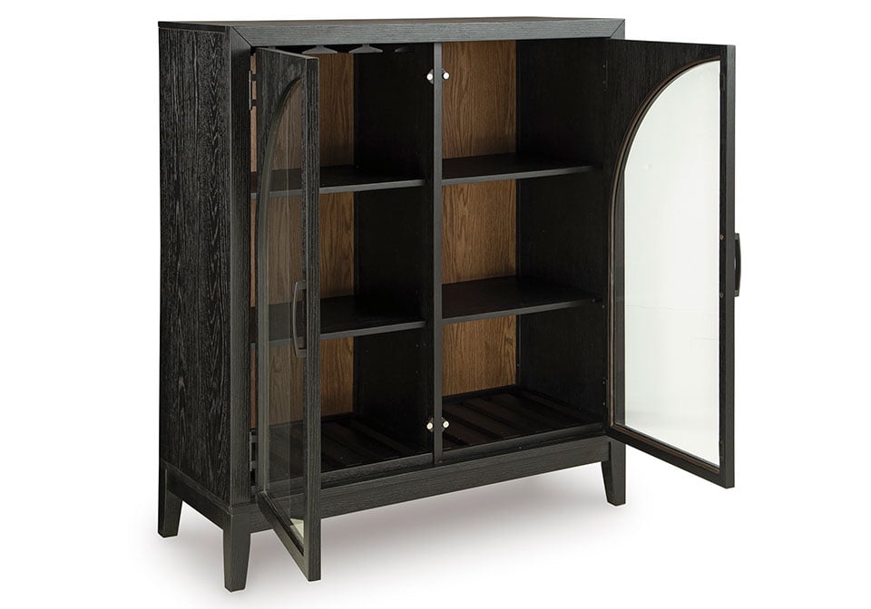 If your love of entertaining is only surpassed by your love of sleek, versatile style, this bar cabinet expertly suits your needs. Racks for wine bottles and glasses neatly store necessities for a pour of vino. Adjustable shelves comfortably hold additional bottles, dishware or drink-making accessories. For added flexibility, the cabinet’s black and natural brown finishes effortlessly pair with your home’s existing aesthetic. Doors with softly curved glass inserts allow this chic piece to double as a display space.