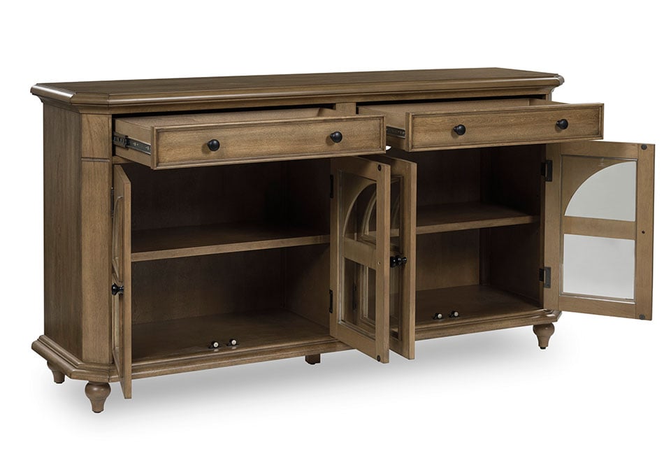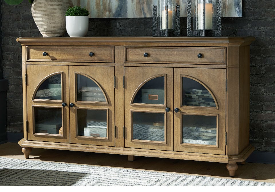 This lovely accent cabinet is a masterful blend of classic charm and practicality. A light brown finish and arched glass panel doors create a timeless look, while the spacious drawers and adjustable shelves offer versatile storage options. Convenient openings in the back for electronics keep those ugly cords out of sight.