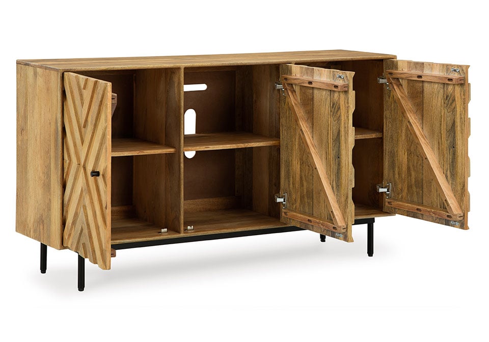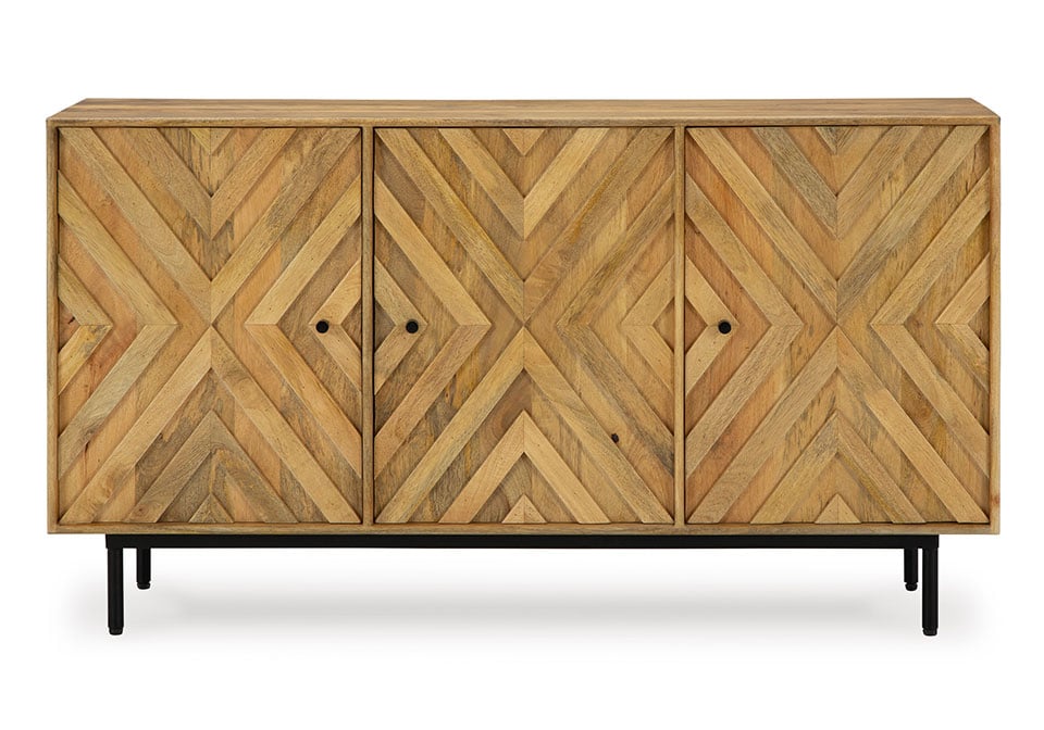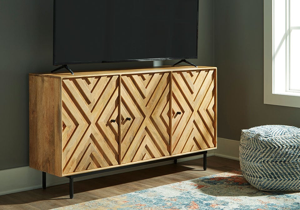 Your search for simple, chic design ends here. A versatile stunner, this accent cabinet adds a sophisticated aesthetic with diamond-patterned drawer fronts and a warm natural finish. It’s gorgeous and ready to serve as a buffet or console.