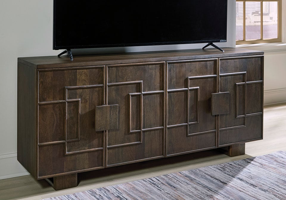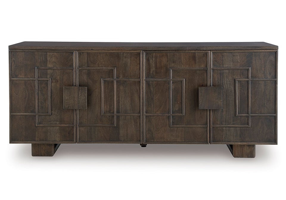 This accent cabinet is a stunning statement piece that combines artistry and functionality. A beautiful dark brown finish and raised geometric-patterned door fronts create a captivating look, while the spacious interior with two shelves offers ample storage. It’s a perfect place to keep your essentials organized and out of sight.