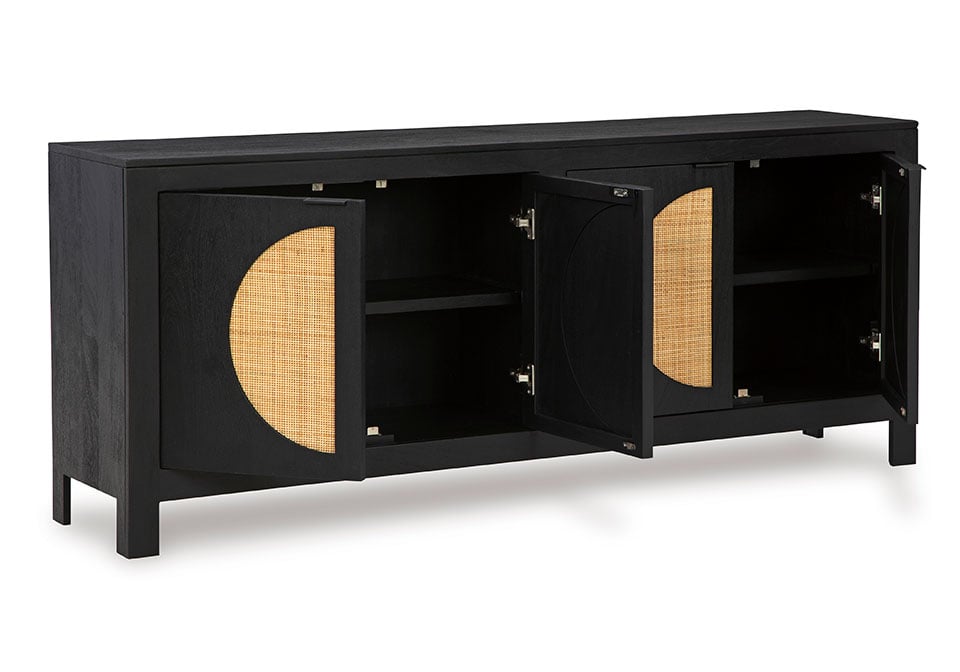 Bring high style and functionality to your home with this contemporary accent cabinet. Woven cane door fronts and a contrasting black finish bring the wow factor to this mid-century inspired piece. Whether it suits your storage needs in the dining room, home office or entryway, it’s quite a showpiece.
