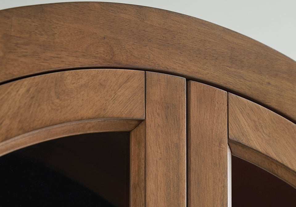 This accent cabinet is a stunning marriage of architectural intrigue and sophisticated storage. Its glass-paneled doors and natural wood tone create an inviting warmth well-suited to transitional spaces. Ideal for showcasing fine china or storing everyday essentials, this versatile piece proves that practical storage can be utterly beautiful.