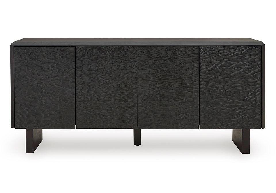 Function and style merge perfectly with this accent cabinet. Crafted of solid wood in a black finish, this piece makes a great case for fresh contemporary design. Doors with a carved pattern open to reveal shelving, while beveled edges add a distinctive touch. Whether you use it for storage or as a TV stand, your love of unique style will shine front and center.