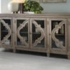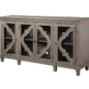 Wowing with exquisite quatrefoil framing, made all the more dramatic with the contrast of clear glass, this 4-door cabinet serves up an easy-elegant aesthetic sure to satisfy. The light and lovely finish brings a relaxed sensibility to the scene.