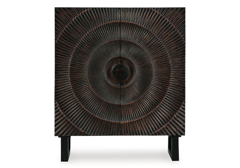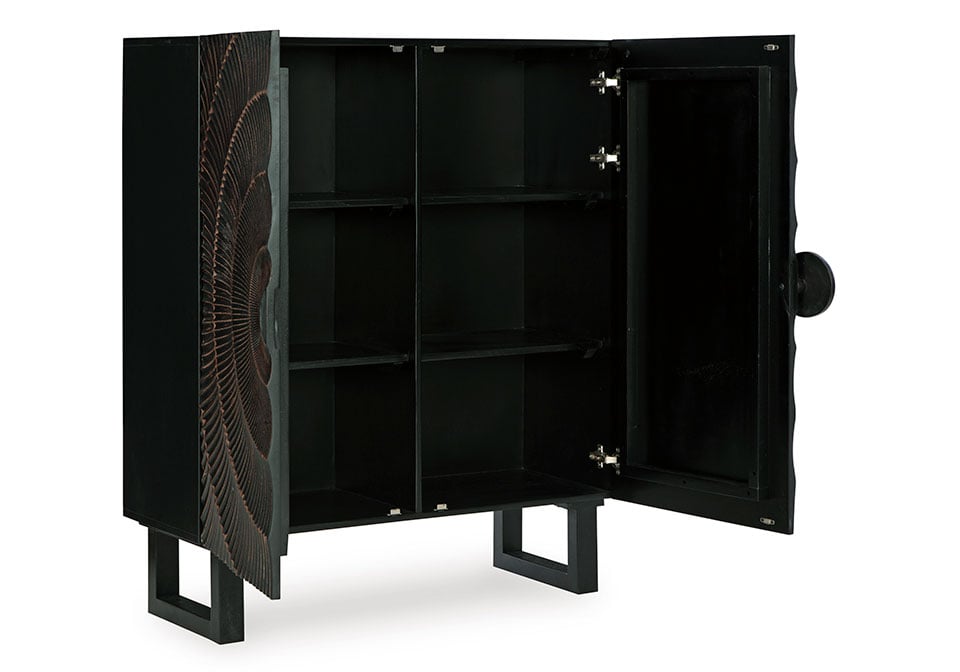High style is on the rise with this wood accent cabinet. Its stunning doors, graced with a carved sunburst pattern and oversized wood pull, open to reveal two shelves. A distressed black finish adds contemporary flair. Whether this cabinet is accommodating storage needs or hiding clutter, it’s truly a showpiece.
