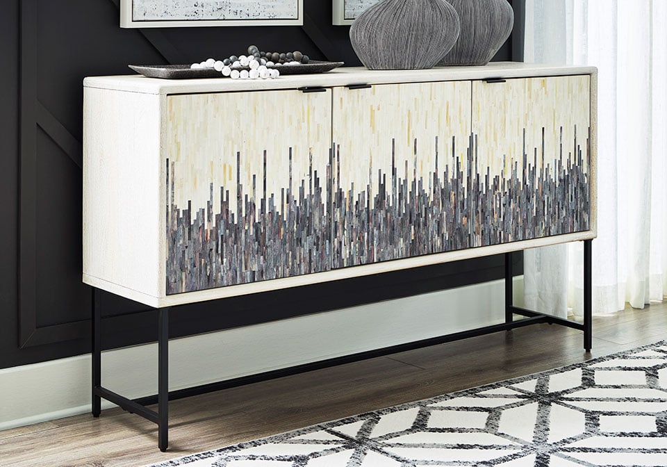 Looking for a showstopping accent for your home? This accent cabinet combines fashion and function in an exclusive way. It offers a creative take on a traditional cabinet, with a strip pattern in white, gray and black. Inside the doors, two shelves suit all your storage needs. Redefine your modern decor with this one-of-a-kind piece.