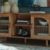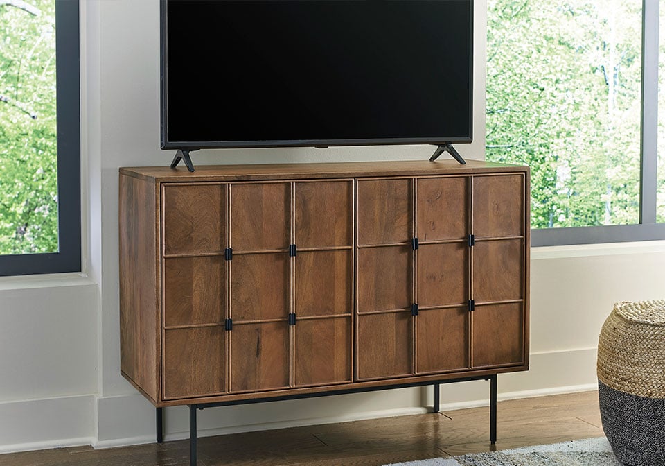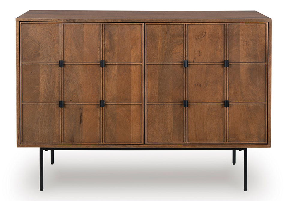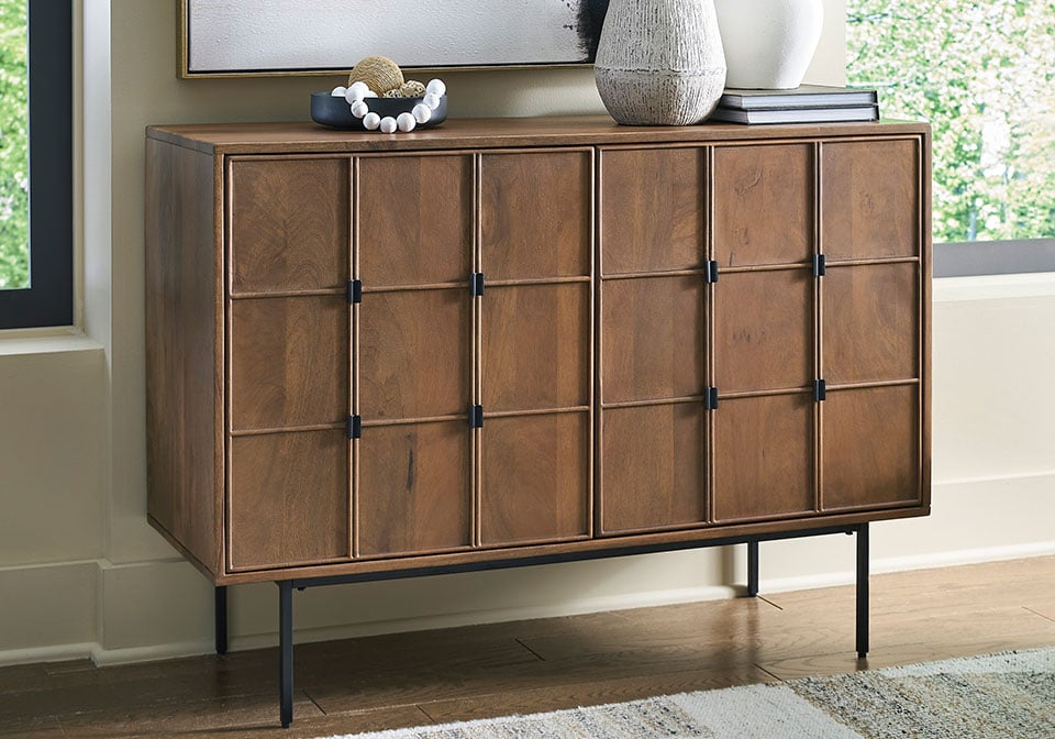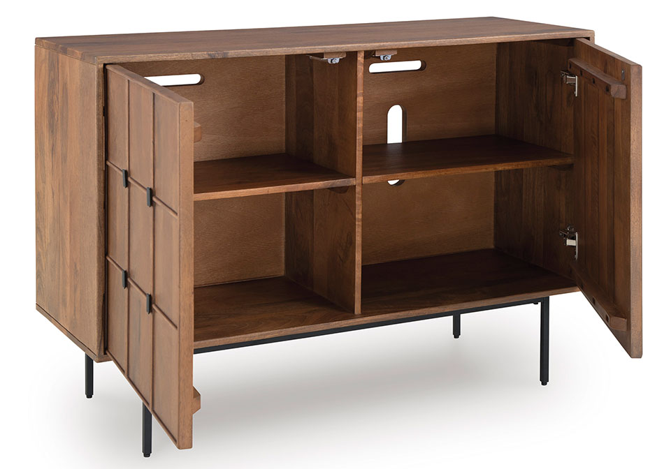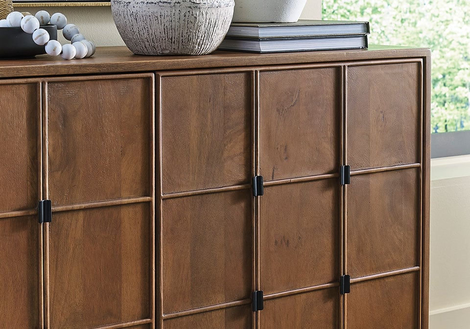 A step above the rest, this accent cabinet is so alluring and versatile. Push magnet doors with a captivating carved grid design open to reveal two interior shelves, keeping you organized in the most casually cool way.