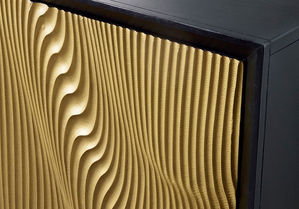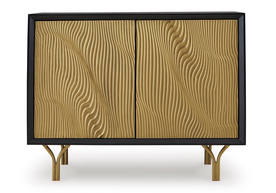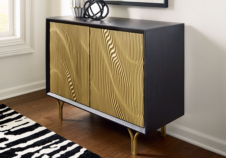 Style? Tons. Storage? Check. This accent cabinet adds more than just a contemporary cool design to your space. Finished in black and goldtone with a carved pattern on the door fronts, it conveys a sophisticated style that’s perfect for a bar area. Push magnet doors open to reveal a shelf. After a long day of adulting, let this piece help you mix up a little reward.