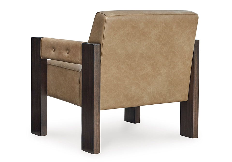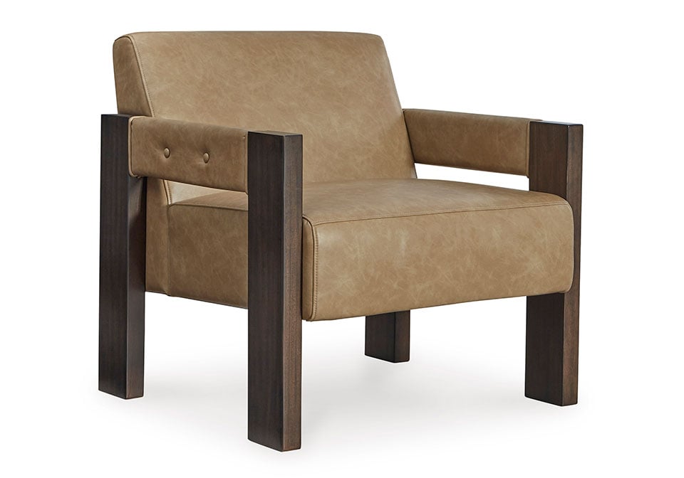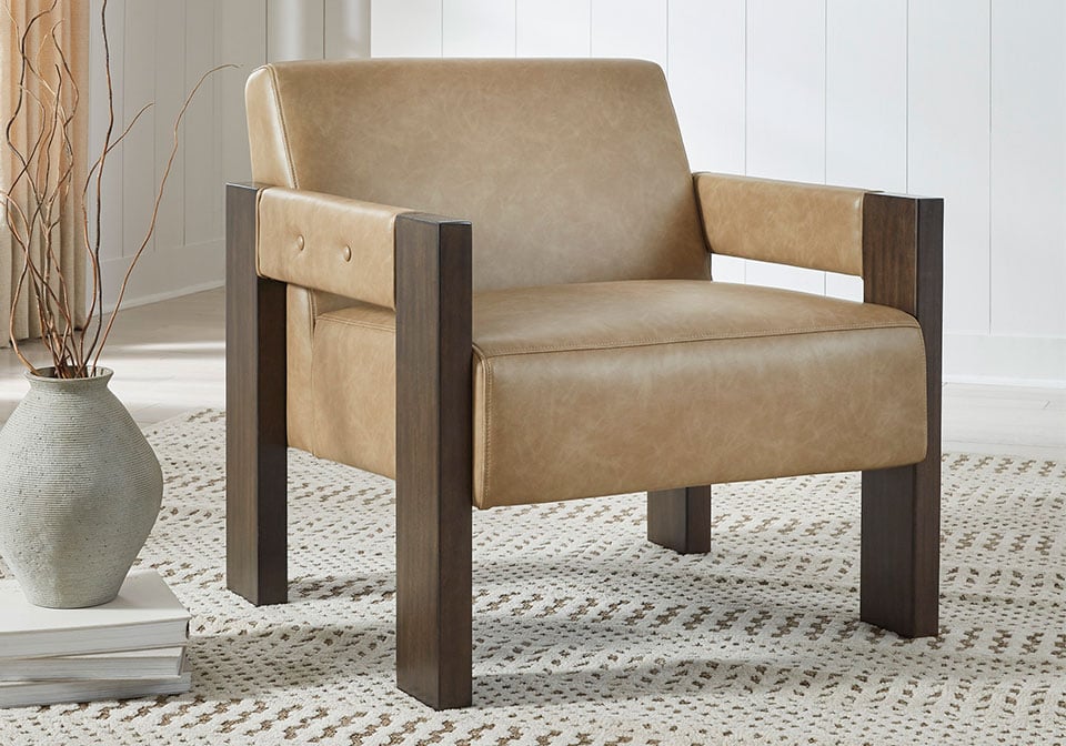 This accent chair is an ultra-contemporary addition to your seating area. Warm espresso-hued wood and neutral faux leather harmonize beautifully for a luxuriously welcoming vibe. Whether you’re cozying up with coffee or settling in to stream your favorite show, relaxing has never been so comfortably chic.