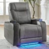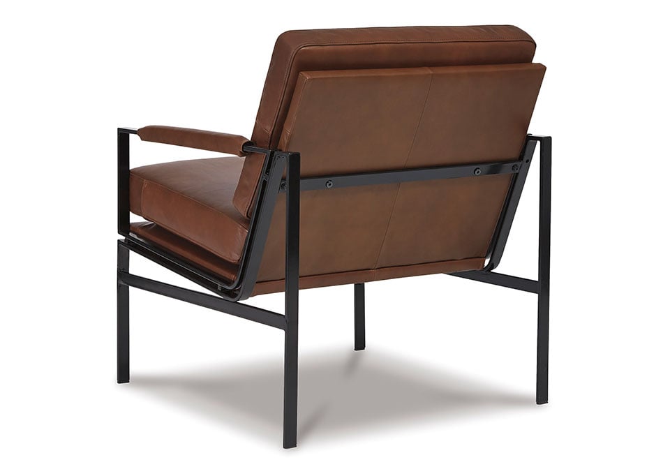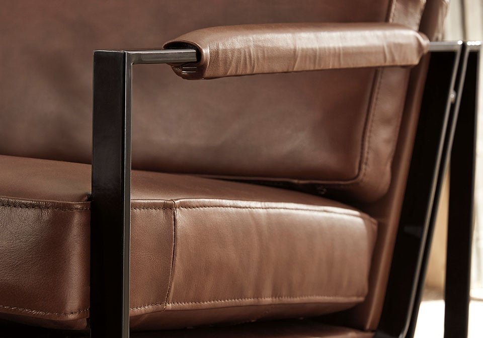 This accent chair has an ultra-modern vibe and indulgent feel. Its metal frame is a chic complement to brown leather seating. With its bronze-tone finish and urban industrial style, this accent chair impresses with high-end looks priced to entice.