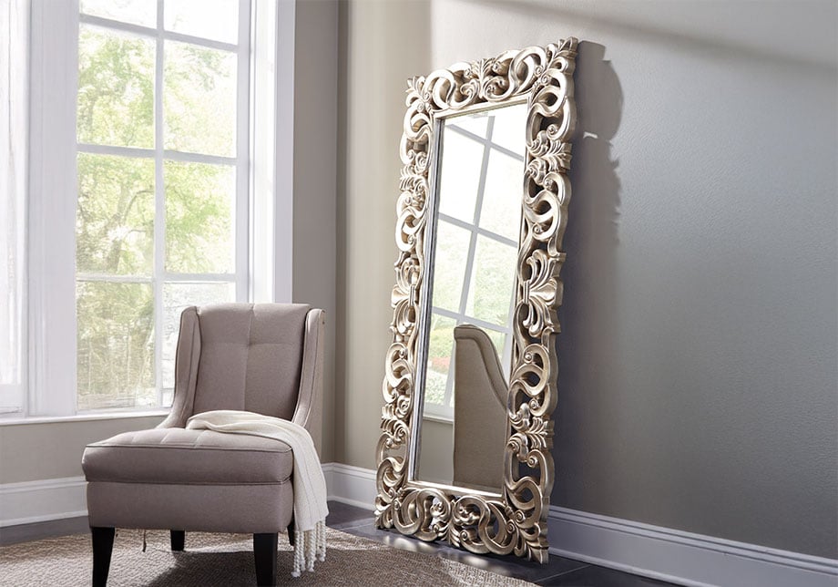 Exquisitely crafted for any glamour queen, this floor mirror is a splendid accent. Antique silver finish brings life to the ornate scroll design.