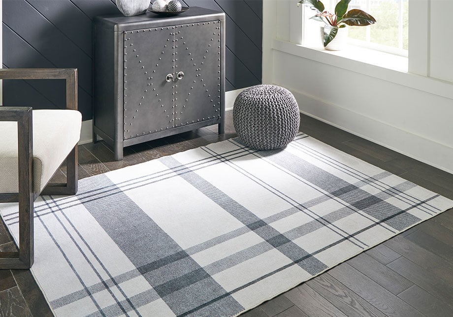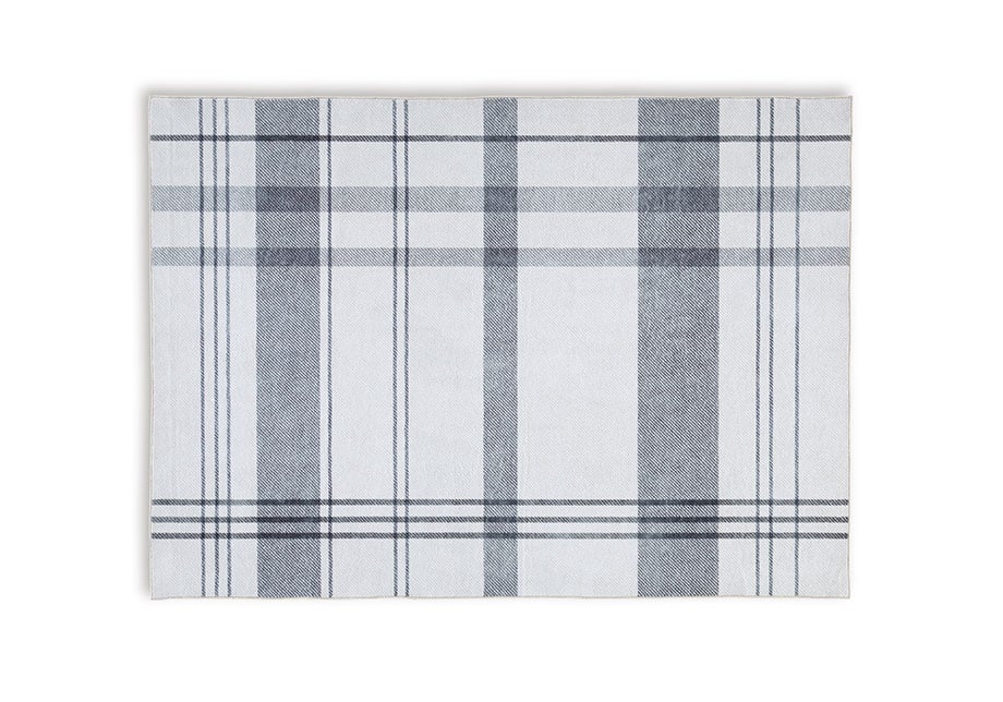 A fresh take on iconic plaid, this accent rug is both classic and contemporary. Its plaid design, with shades of gray crisscrossing against a solid cream background, has subtle variations that offer an artisanal feel. In addition, the machine woven material is durable and super soft underfoot. This rug is ready for real life—when spills or stains happen, just toss it in the washing machine.
