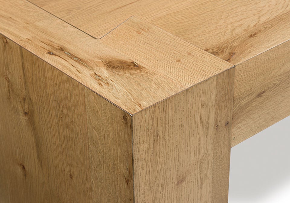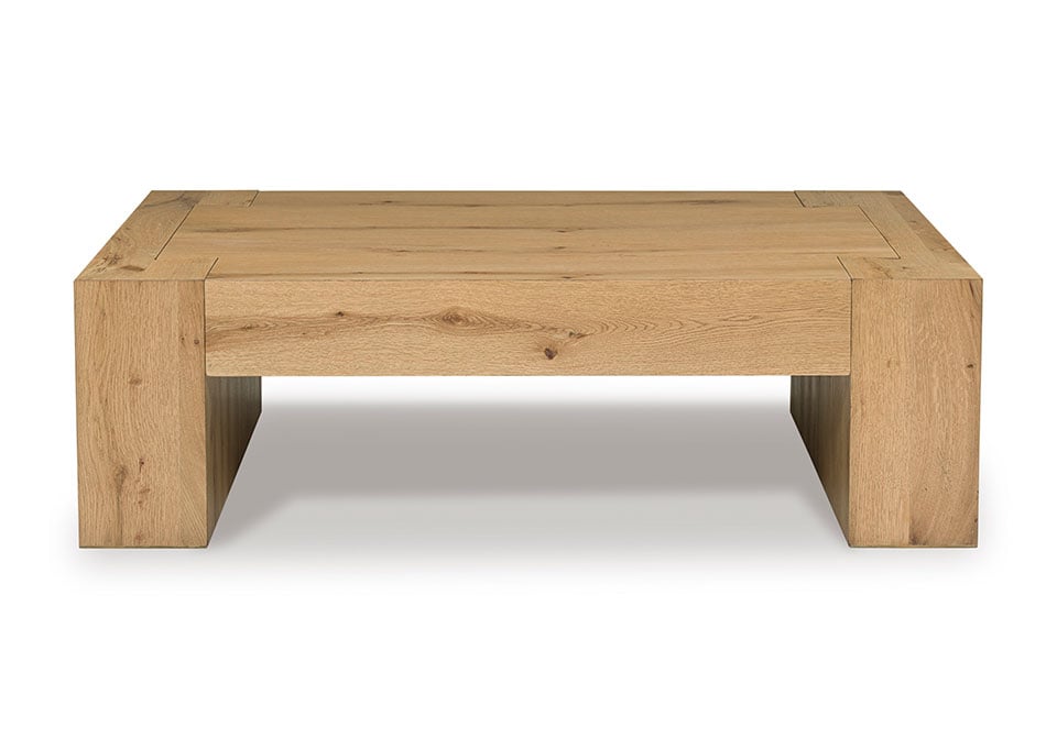 Rustic style. Refined design. This coffee table marries a substantial silhouette with natural materials. A glazed light finish enhances the unique character of its oak veneer. Loaded with both homespun charm and contemporary flair, this table effortlessly elevates casual aesthetics.