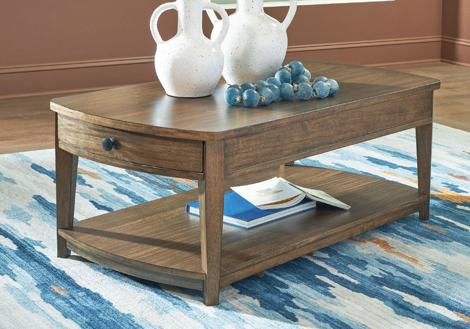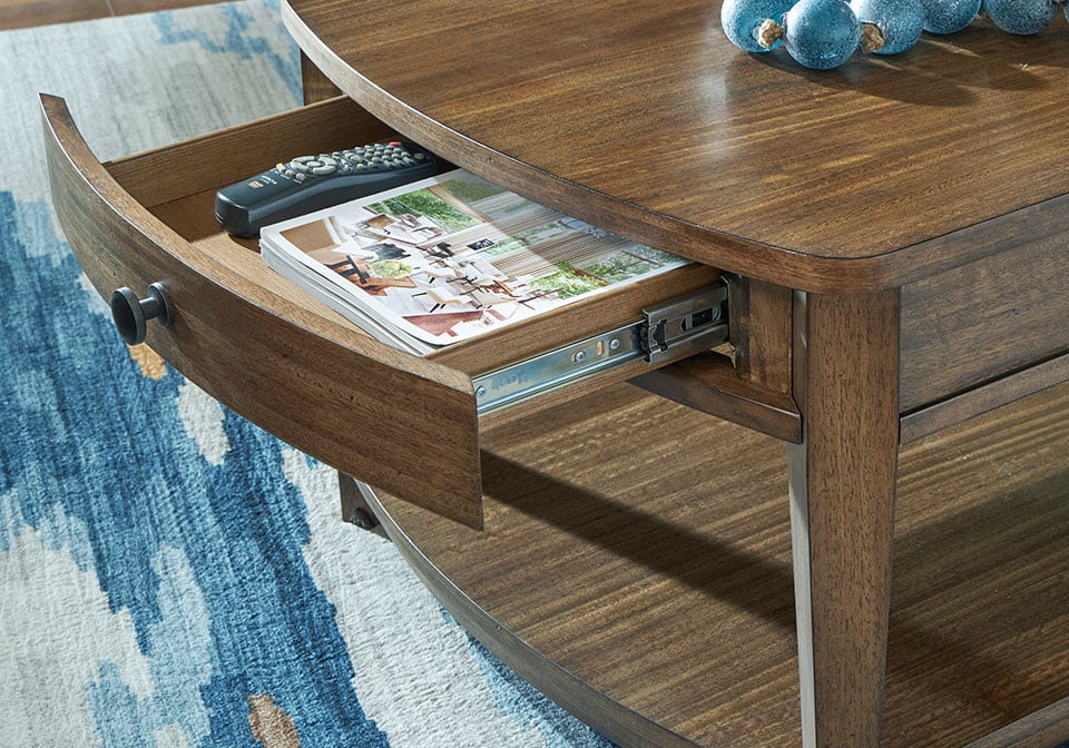 Serving up transitional style at its best, this striking coffee table looks equally at home in traditional and modern settings. Its classic brown finish merges effortlessly with a softly rounded top and tapered legs for a timeless, contemporary vibe. A lower shelf beautifully accommodates baskets, magazines, plants and more, while two end drawers keep entertainment essentials close by.