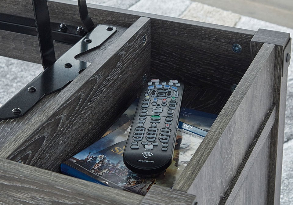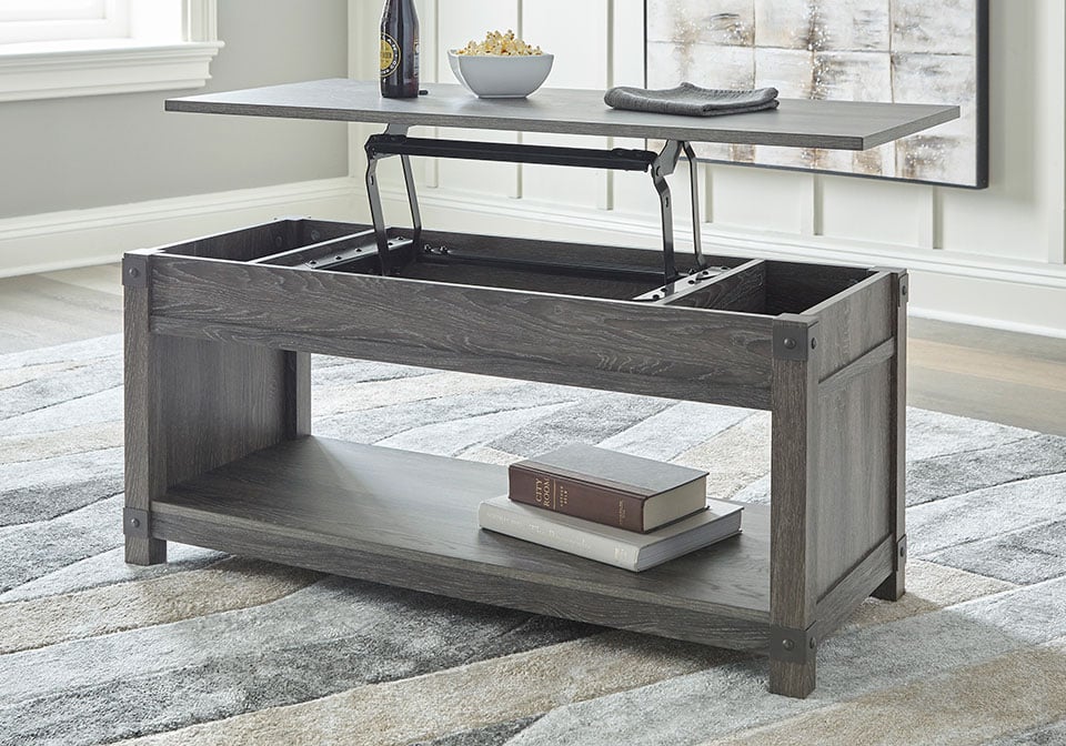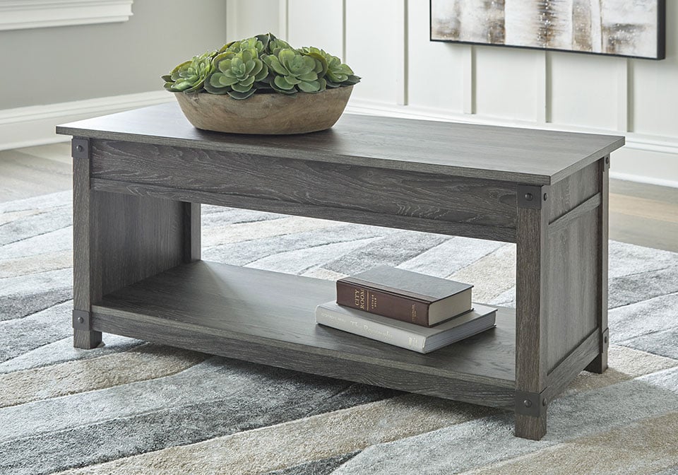 Open the door to modern farmhouse style with this lift-top coffee table. The beautiful woodgrain look and classic crossbuck metal accents are a cool touch, while the lower shelf provides surface space for fashionable home accessories. Sporting a gray replicated wood grain effect, its handy spring-loaded mechanism brings the tabletop closer to you. This versatile table makes it easier than ever to eat, work or play from the comfort of your sofa.