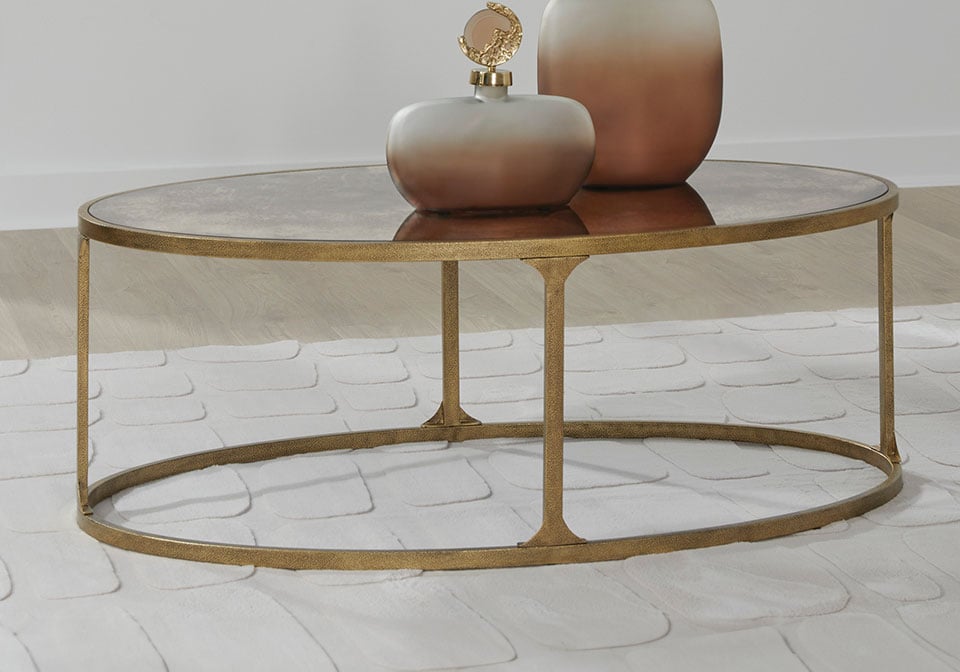 This coffee table blends a traditional feel with contemporary design cues. Antiqued gold texturing on the frame has the look of timeworn, hand-forged metal. A tempered glass top with a faux marble finish provides a refined contrast. Chic when hosting decor or holding entertainment essentials, this table rounds out your living room with transitional flair.