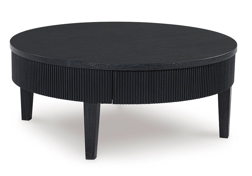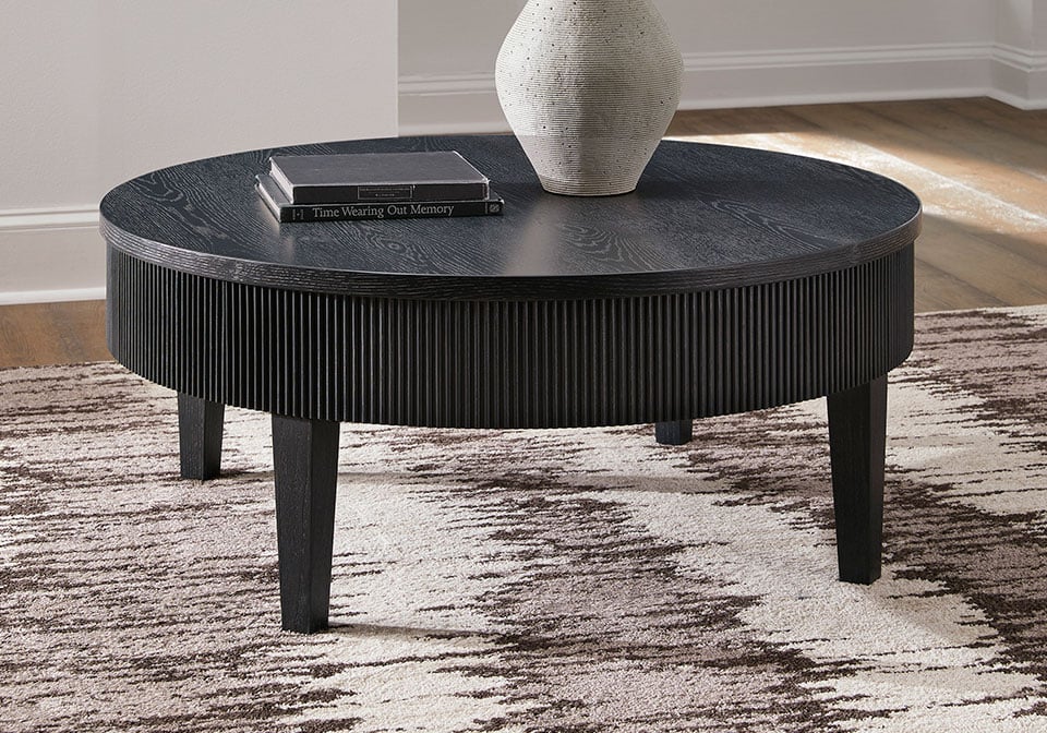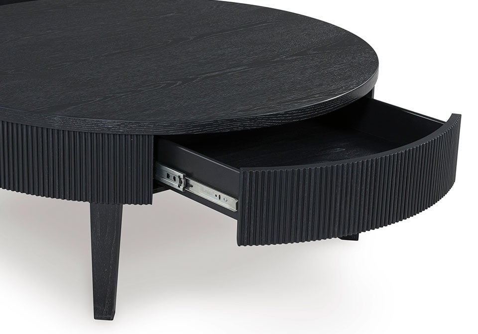 Classic and cool in dark charcoal, this coffee table brings contemporary convenience to your living room. Short on storage? The trendy reeded apron conceals a drawer perfect for remotes, controllers and other entertainment accessories. What a perfect marriage of style and functionality.