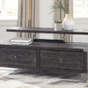 Made with Pine solids and veneers and finished in a dark grayish brown weather washed color with wire brushing texture. Tables have contrast metal corner accents and angled metal legs. Cocktail table features a half lift top surface, fully finished drawers with removable storage trays. T901-3 end tables have drawer storage and a rear mounted AC power supply with (2) USB charging ports.