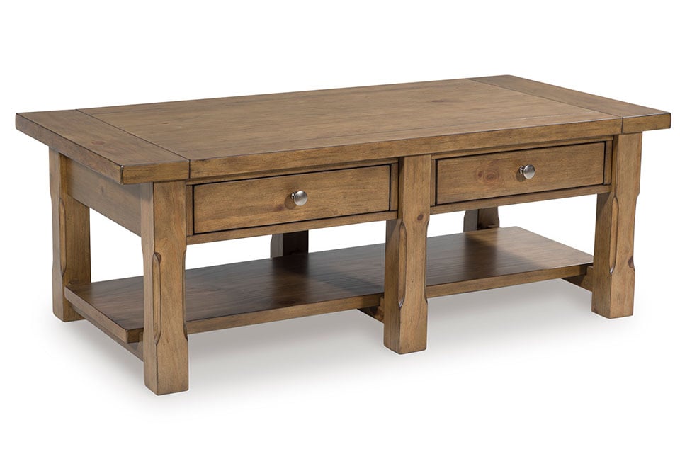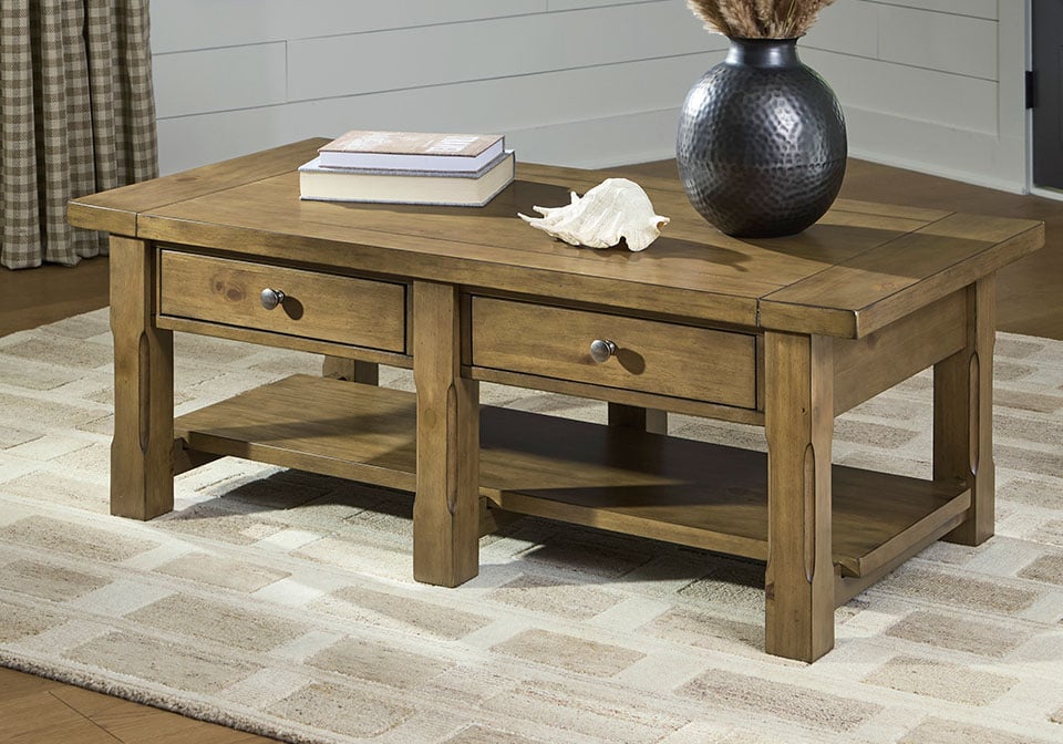 The timeless styling of this coffee table is well-suited to casual and farmhouse-inspired spaces. Its versatile burnished brown finish seamlessly pairs with neutrals and muted tones alike. With drawers for sofa-side storage and a bottom shelf for displaying decor, this chic table beautifully suits everyday living.