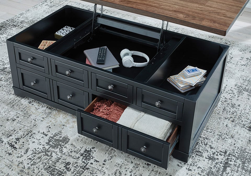Raise the bar on modern farmhouse style with this lift-top coffee table. Its sturdy silhouette and casual good looks are accentuated with a two-tone finish, which pairs a warm satin black base with a contrasting butcher block veneer top. Combining form and function, its lift top extends for a casual dinner or extra work space in front of your sofa. Two spacious lower drawers and handy storage bins under the top make this piece awfully useful, too. Whether your style is vintage, country or eclectic, this table adds a hearty element.