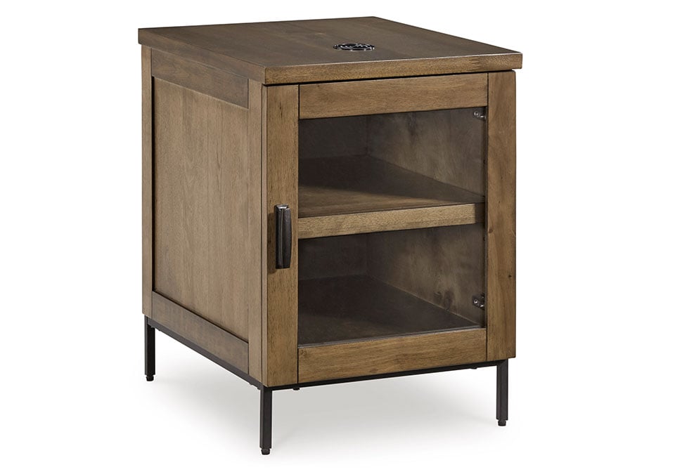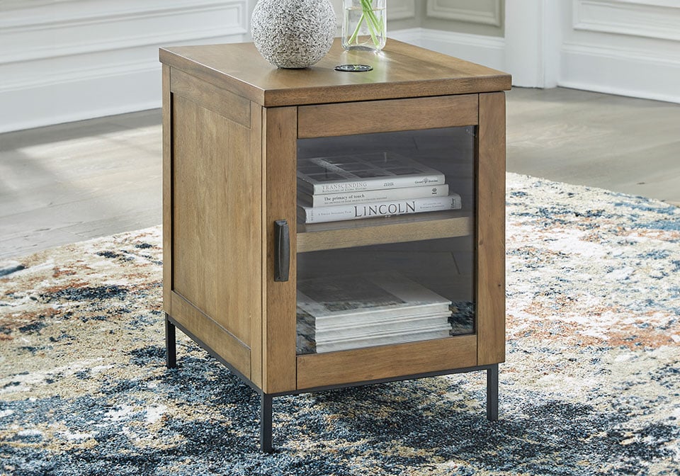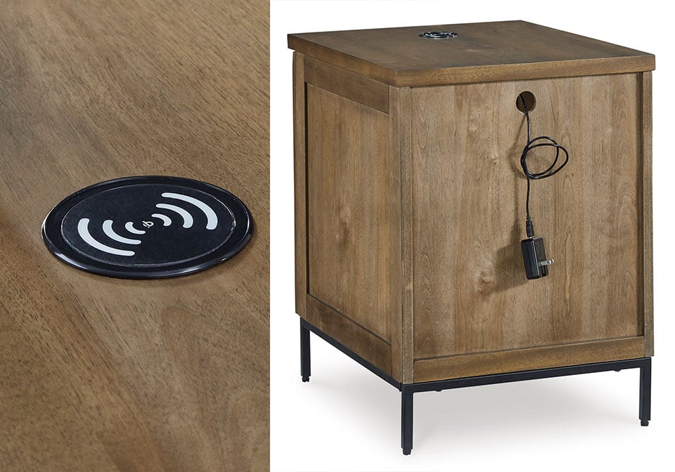 Made for the everyday, this chairside end table is a sleek complement to your casual contemporary living room. You’ll love the refined-yet-relaxed vibe of its contrasting medium brown finish and matte black legs. Simultaneously store and display decor behind the glass-front door. And for added function, a wireless charger keeps your tabletop free of clutter-causing cords.