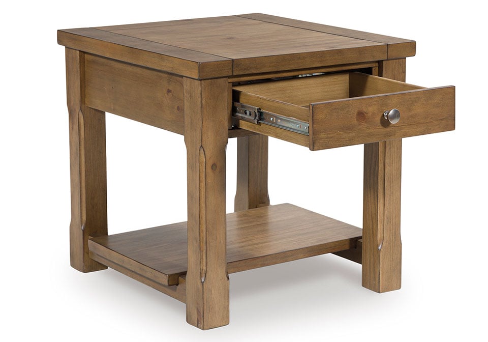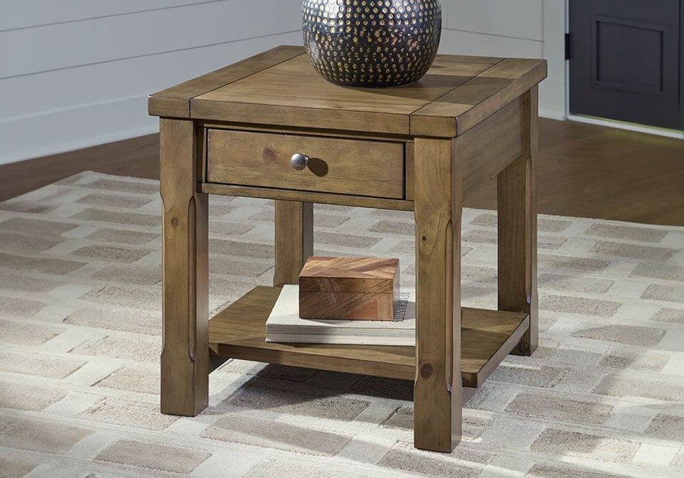 The timeless styling of this end table is well-suited to casual and farmhouse-inspired spaces. Its versatile burnished brown finish seamlessly pairs with neutrals and muted tones alike. With drawers for sofa-side storage and a bottom shelf for displaying decor, this chic table beautifully suits everyday living.