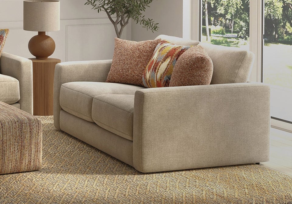 Soft, durable beige fabric upholstery. Clean, modern silhouette with low arms. Plush, deep seating for ultimate comfort. Vibrant, multi-pattern accent designs. Sturdy Steel frame for lasting support. Versatile neutral tones complement any décor.