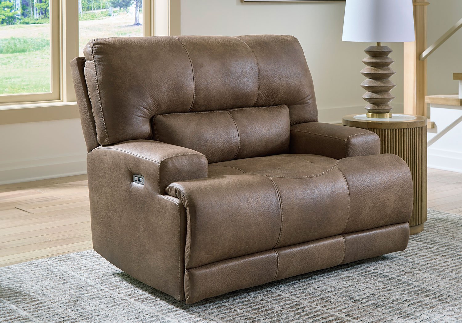 Expansive and elegant, this power reclining Series makes a sizable style statement. Its large scale enhances the luxe look and magnifies the beauty of faux leather in an earth tone, punctuated with jumbo stitching. One-touch power adjustable headrests mean infinite ways to recline in stylish comfort. USB charging completes the experience.