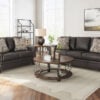 Pull tab reclining motion. Corner-blocked frame with metal reinforced seat. Attached cushions. High-resiliency foam cushions wrapped in poly fiber. Faux leather upholstery. Decorative turned legs with faux wood finish. 360-degree swivel. Gentle rocking motion.