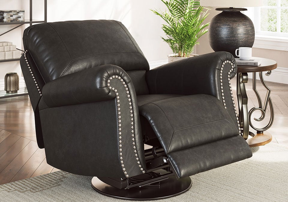 Everyone can have the best seat in the house with this swivel glider recliner. Its nailhead trim puts the finishing touches on the traditional roll arms you love. The recliner’s comfy, durable cushions—wrapped in a rustic yet sophisticated faux leather—keep you feeling relaxed, while its turned legs show that style and quality flow from top to bottom. Plus the smooth reclining motion and 360-degree swivel keep you in the flow of conversation.
