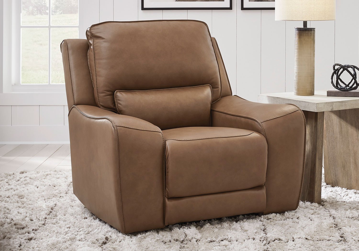 Live and lounge luxuriously. This power reclining sofa brings an ultra-stylish flair to your home’s central hub. Its seating area is wrapped in top-grain leather in a rich caramel coloration, giving you a trend-right look made all the better with high-quality materials. And with the simple push of a button, you can recline or adjust the headrests to find your ideal comfort position.