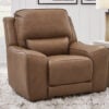 Live and lounge luxuriously. This power reclining sofa brings an ultra-stylish flair to your home’s central hub. Its seating area is wrapped in top-grain leather in a rich caramel coloration, giving you a trend-right look made all the better with high-quality materials. And with the simple push of a button, you can recline or adjust the headrests to find your ideal comfort position.