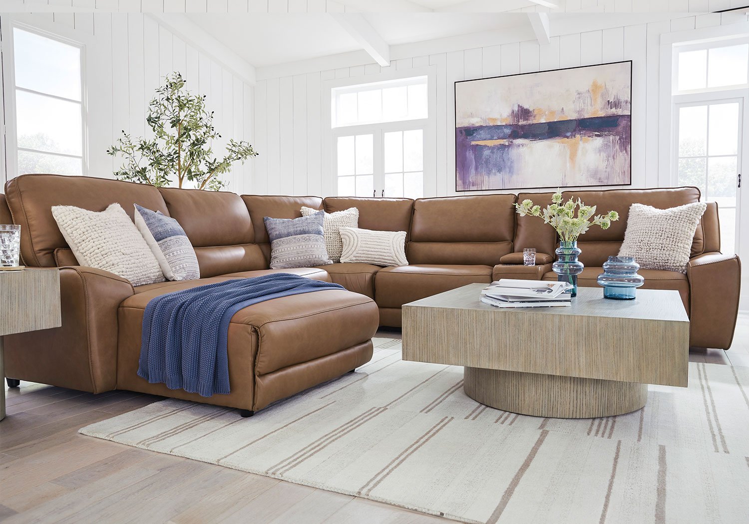Live and lounge luxuriously. This power reclining sectional with chaise brings an ultra-stylish flair to your home’s central hub. Its seating area is wrapped in top grain leather in a rich caramel color, giving you a trend-right look made all the better with high-quality materials. And with the simple push of a button, you can adjust the headrests or recline to find your ideal comfort position.