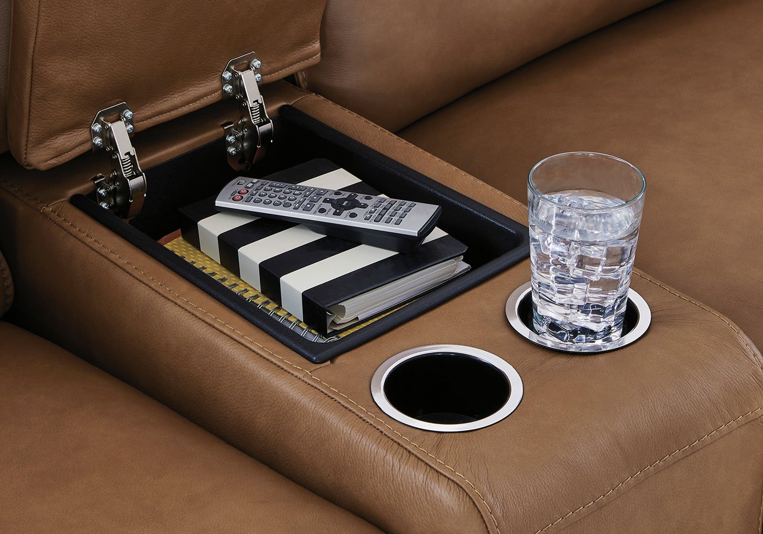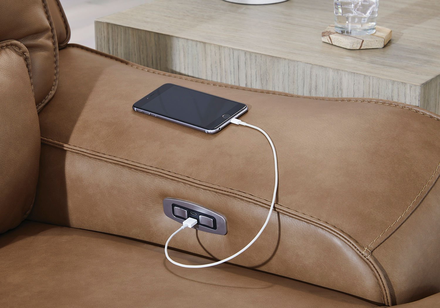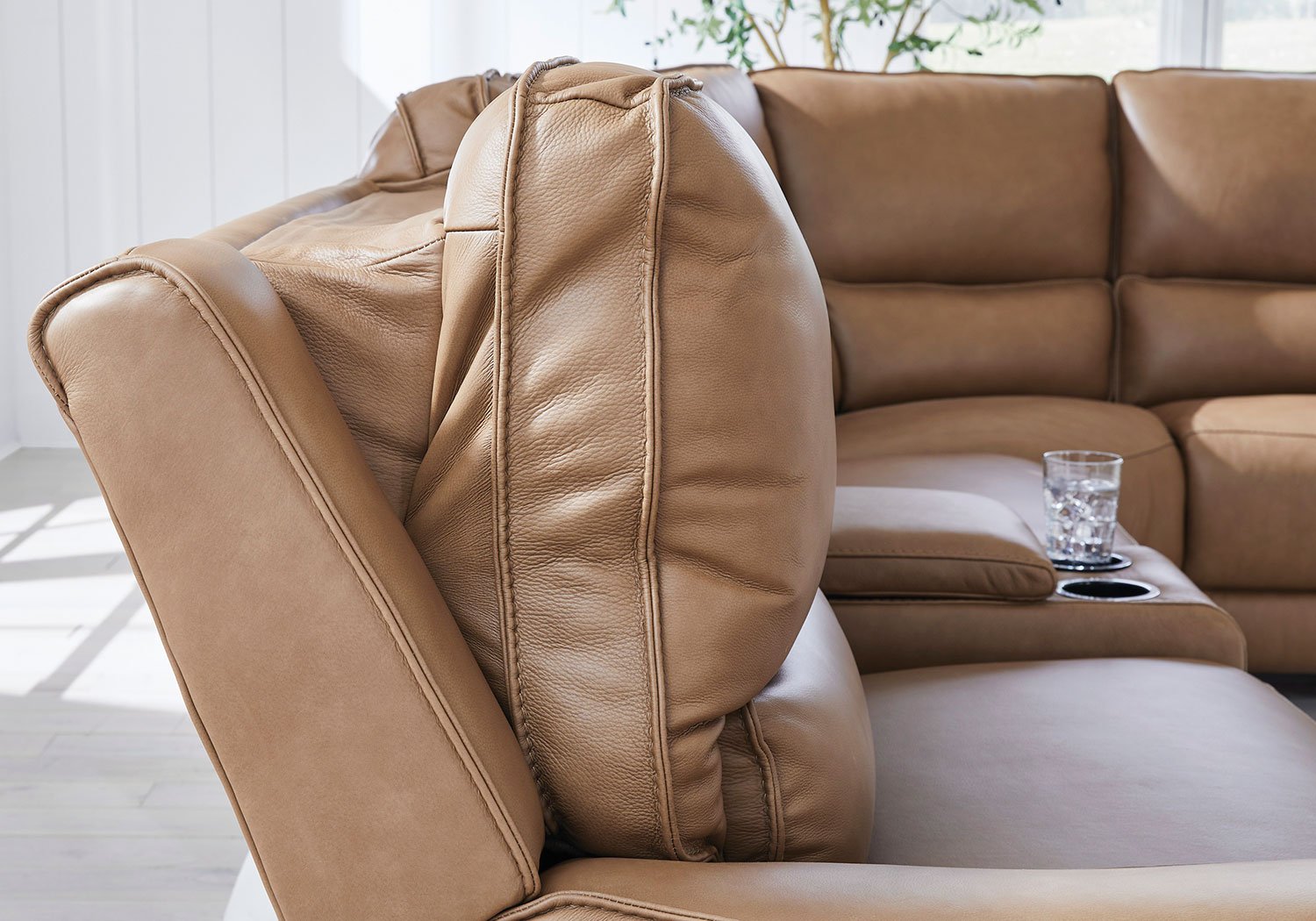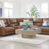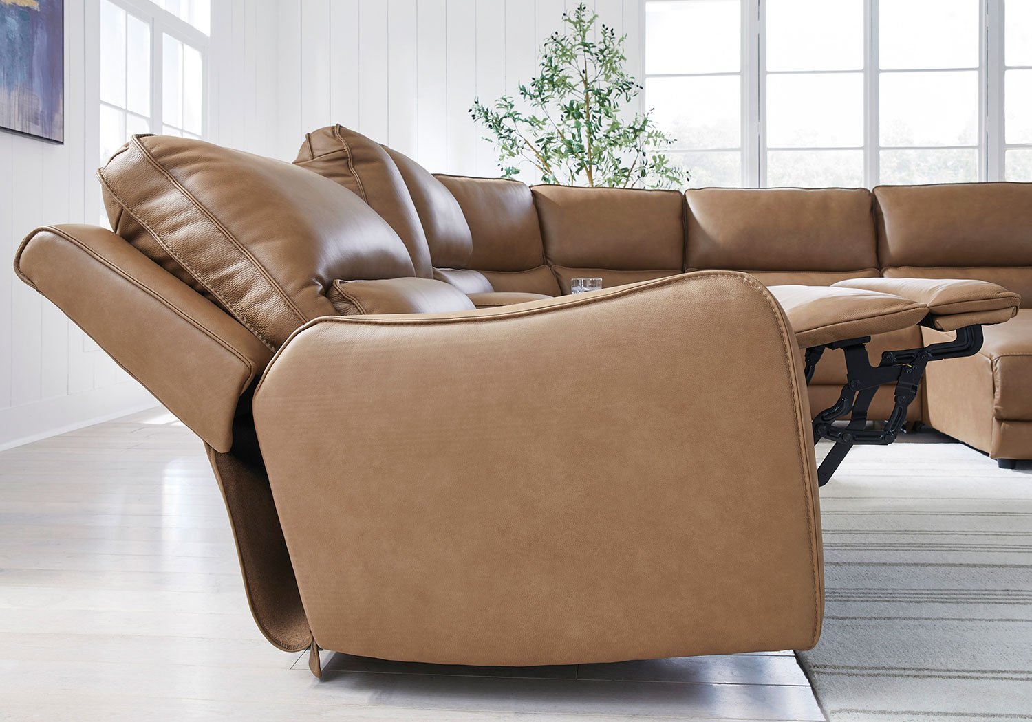 Live and lounge luxuriously. This power reclining sectional with storage console brings an ultra-stylish flair to your home’s central hub. Its seating area is wrapped in top grain leather in a rich caramel color, giving you a trend-right look made all the better with high-quality materials. And with the simple push of a button, you can adjust the headrests or recline to find your ideal comfort position.