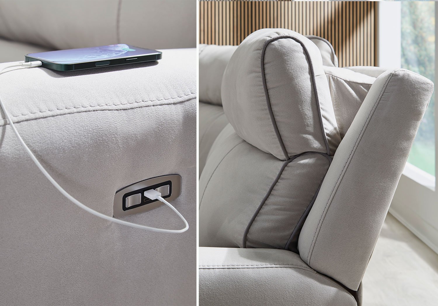 Smart, clean and ultra modern, this power reclining sectional is utterly in vogue. You’ll love its indulgent cushions and contemporary bustle back styling. The sumptuous fabric, accentuated with contrasting welting, easily blends with your decor. A convenient console with storage and cup holders keeps essentials handy. And with reclining at the press of a button, this modular sectional proves chic design and superb comfort go hand in hand.