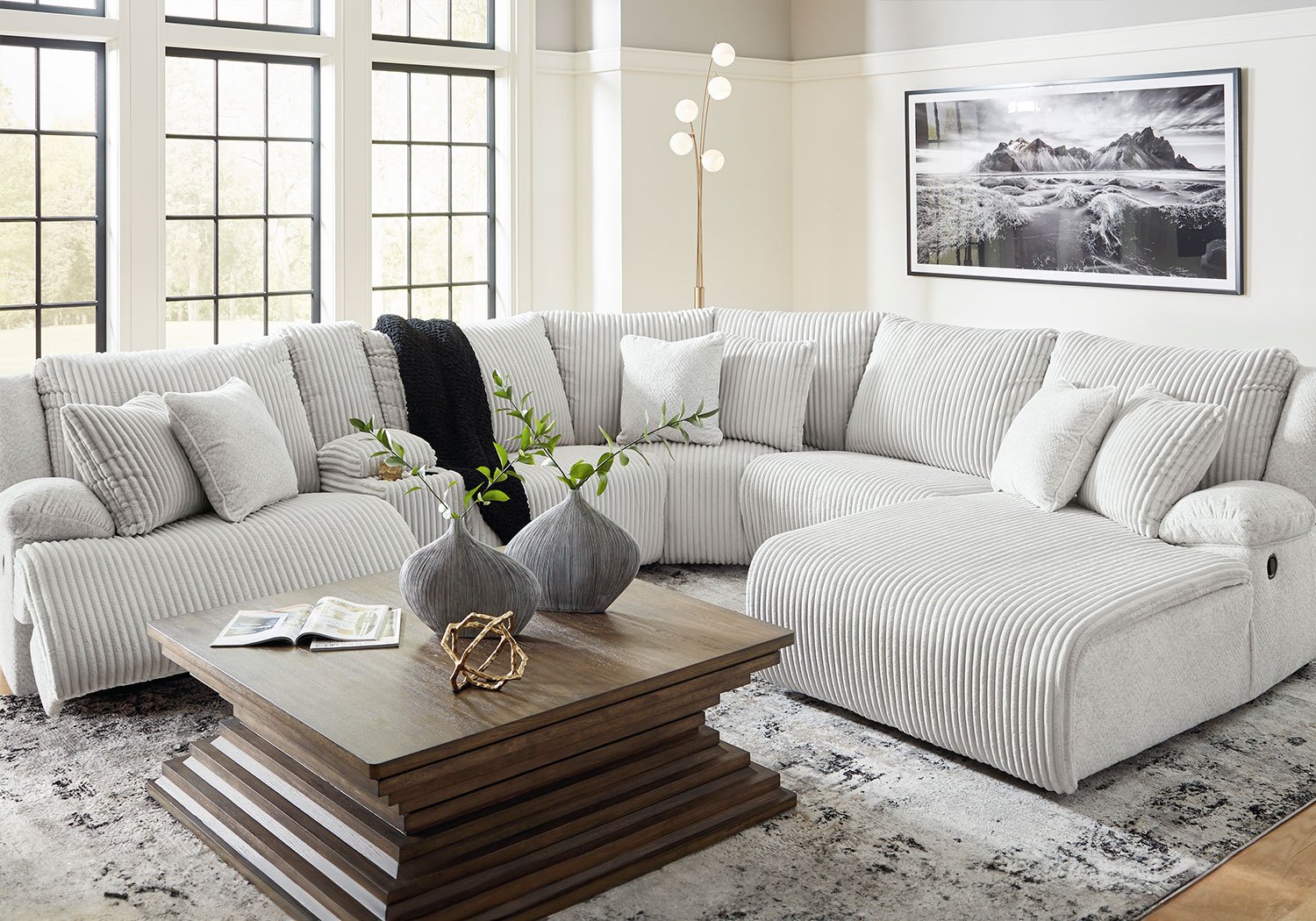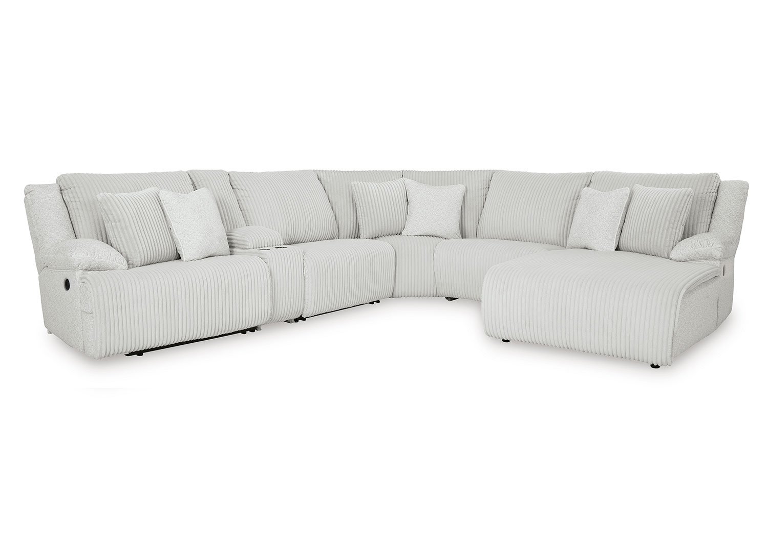 Experience unparalleled comfort with this reclining sectional with chaise. It’s a stylish and invitingly soft look—made all the more appealing by cozy corduroy cushions that feel great and add a touch of texture. The neutral hue effortlessly blends into your decor, making it a gorgeous addition to your home. So sit back and unwind in this spacious set, perfect for gatherings with friends and family.