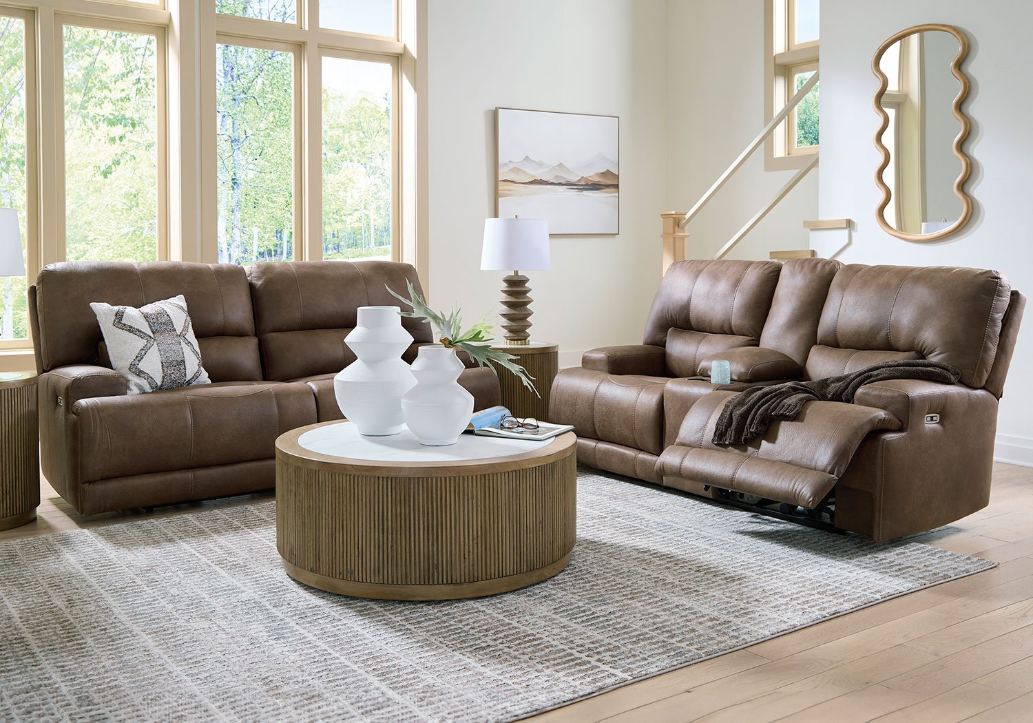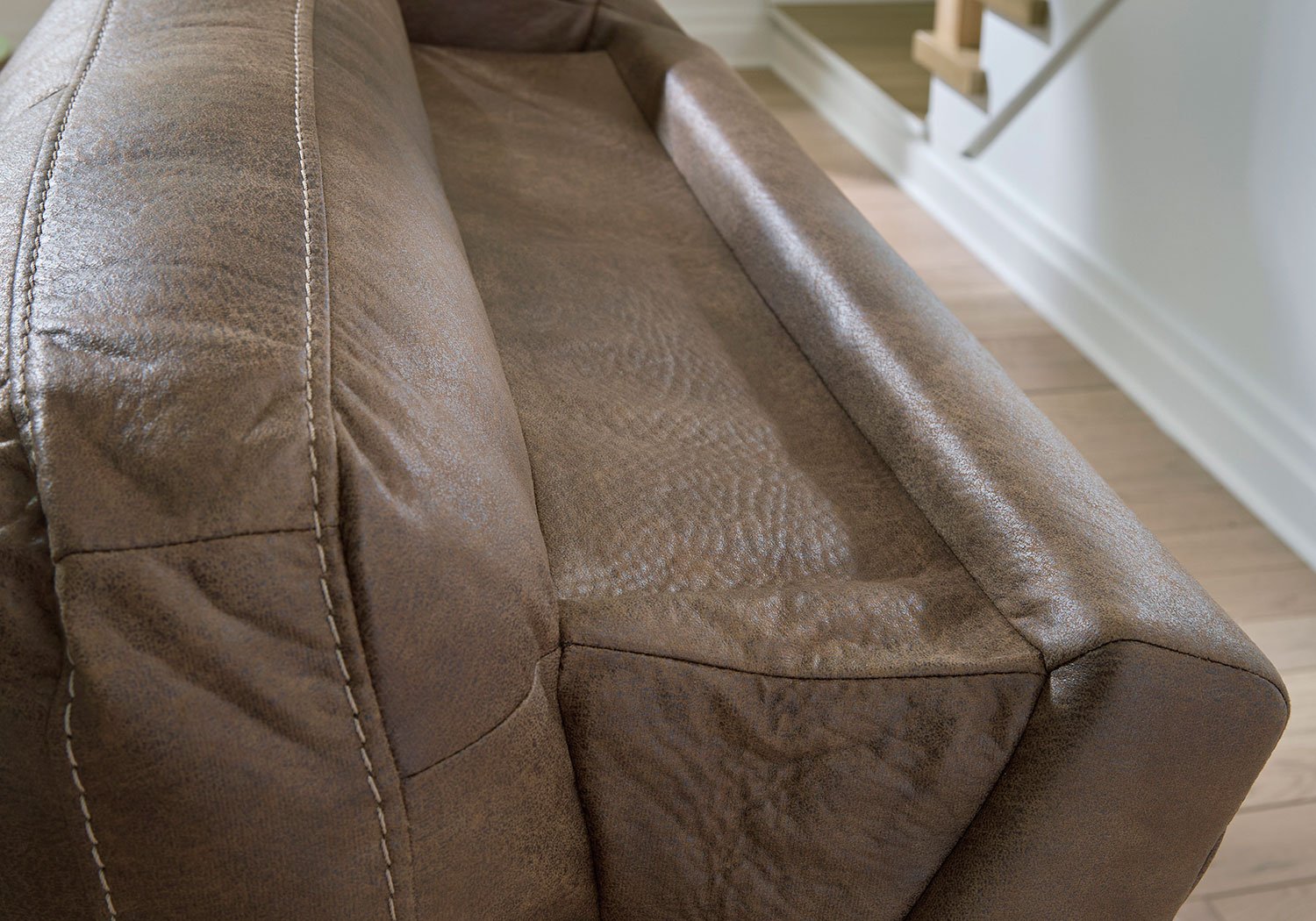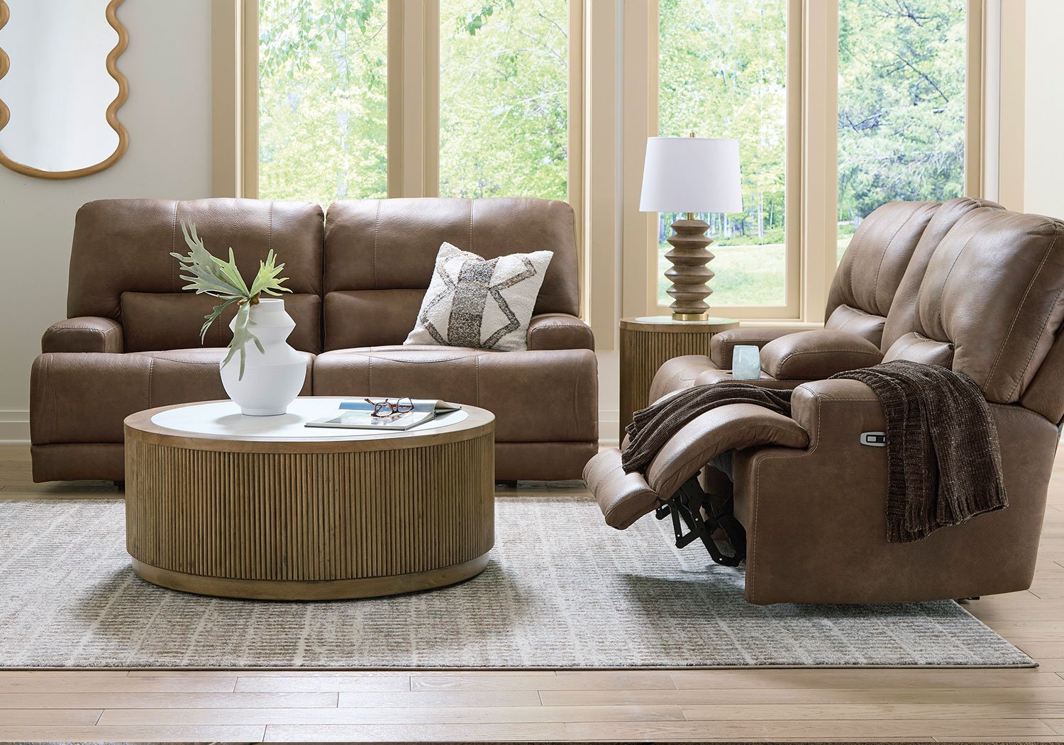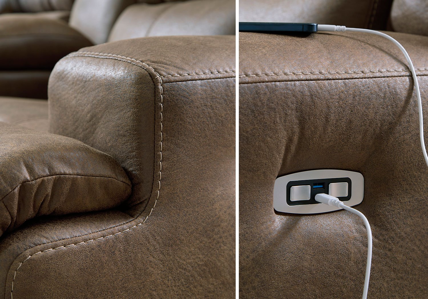 Expansive and elegant, this power reclining Series makes a sizable style statement. Its large scale enhances the luxe look and magnifies the beauty of faux leather in an earth tone, punctuated with jumbo stitching. One-touch power adjustable headrests mean infinite ways to recline in stylish comfort. USB charging completes the experience.