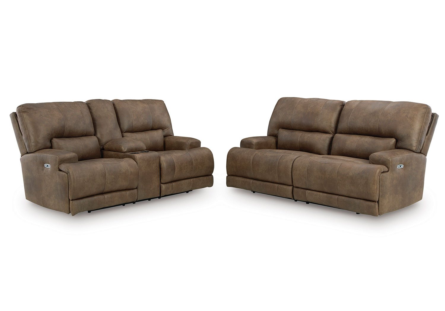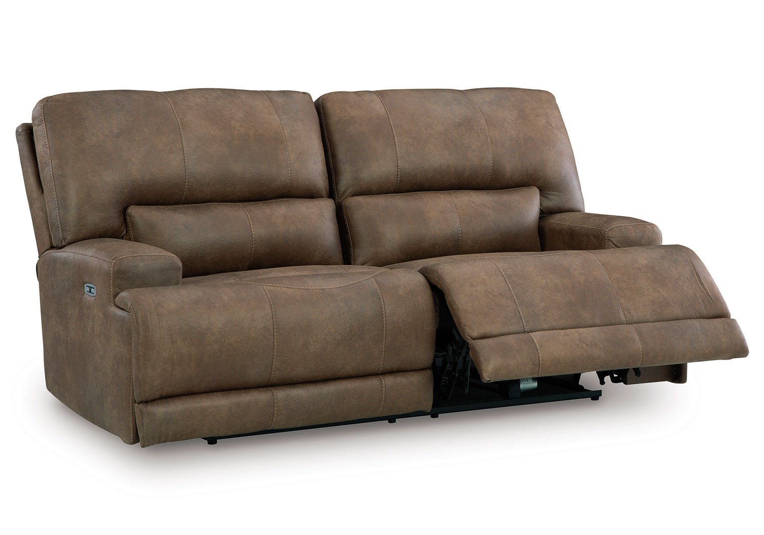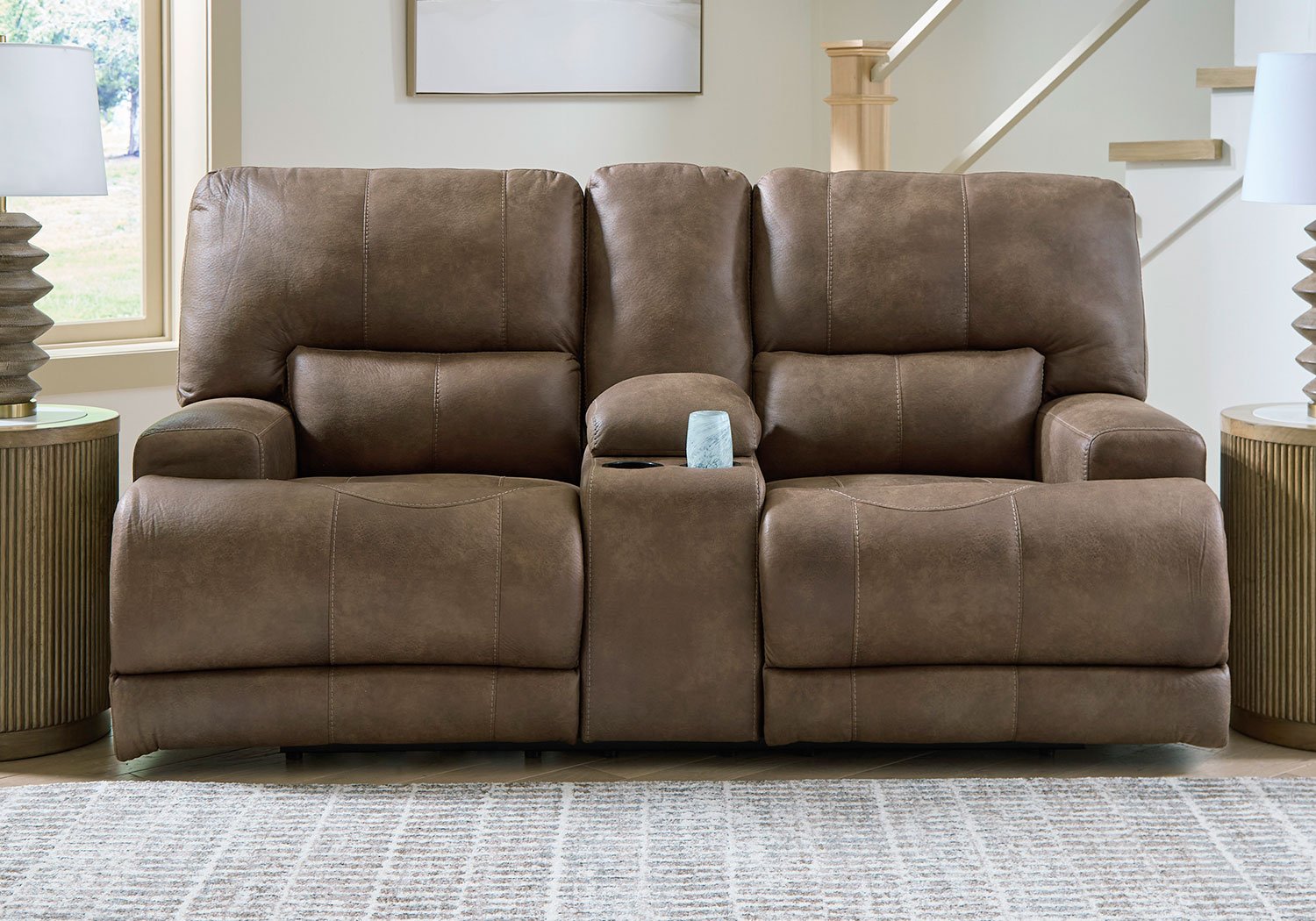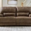 Expansive and elegant, this power reclining Series makes a sizable style statement. Its large scale enhances the luxe look and magnifies the beauty of faux leather in an earth tone, punctuated with jumbo stitching. One-touch power adjustable headrests mean infinite ways to recline in stylish comfort. USB charging completes the experience.