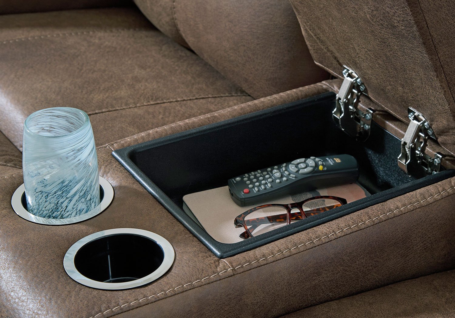 Dual-sided recliner; middle seat remains stationary. One-touch power control with adjustable positions, Easy View™ adjustable headrest and zero-draw USB-A and USB-C ports. Zero-draw technology only consumes power when the USB receptacle is in use. Zero-gravity mechanism allows optimum reclining comfort with infinite reclining positions at the touch of a button. Corner-blocked frame with metal reinforced seat. Attached cushions. High-quality foam cushions wrapped in poly fiber. Faux leather upholstery.