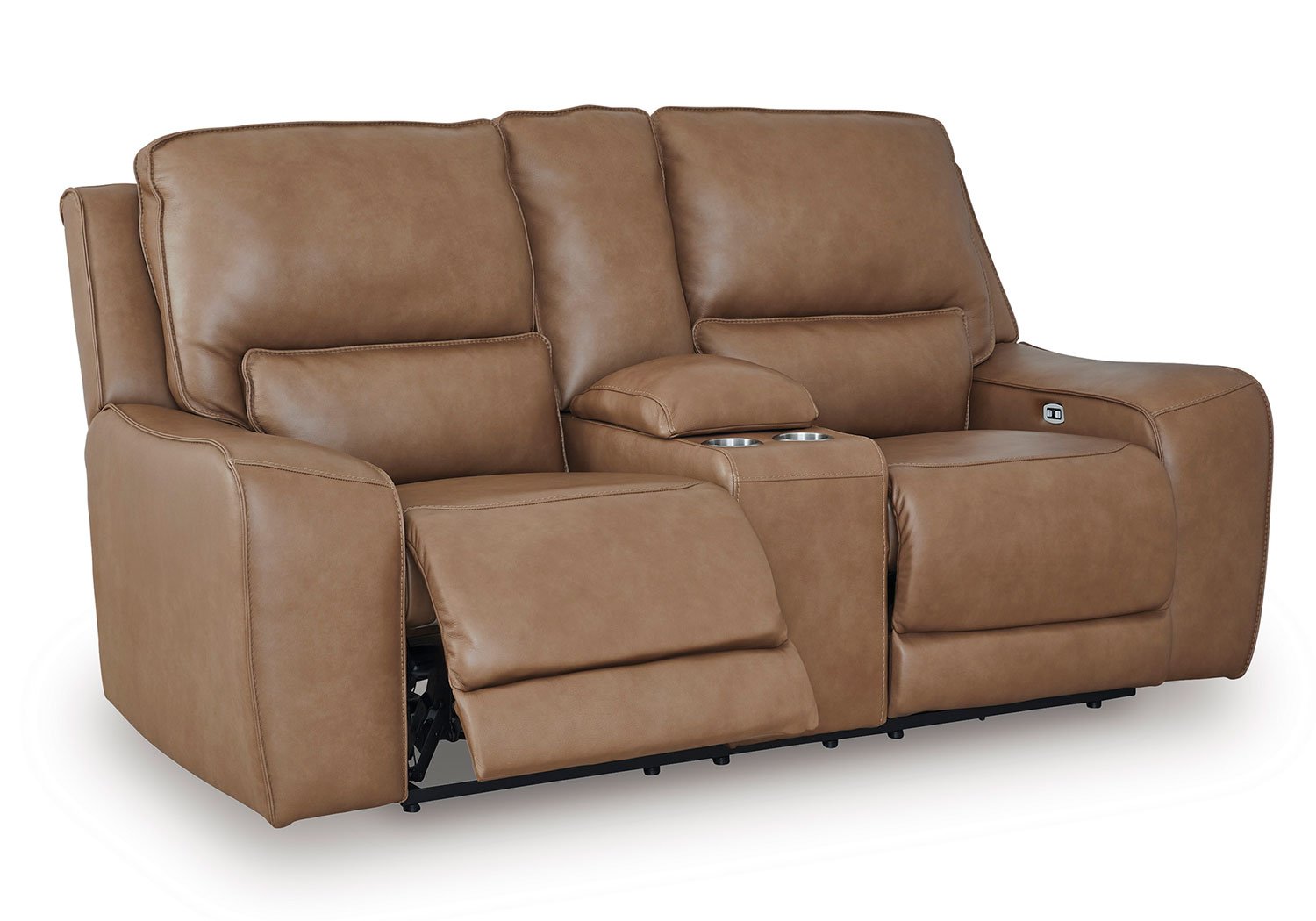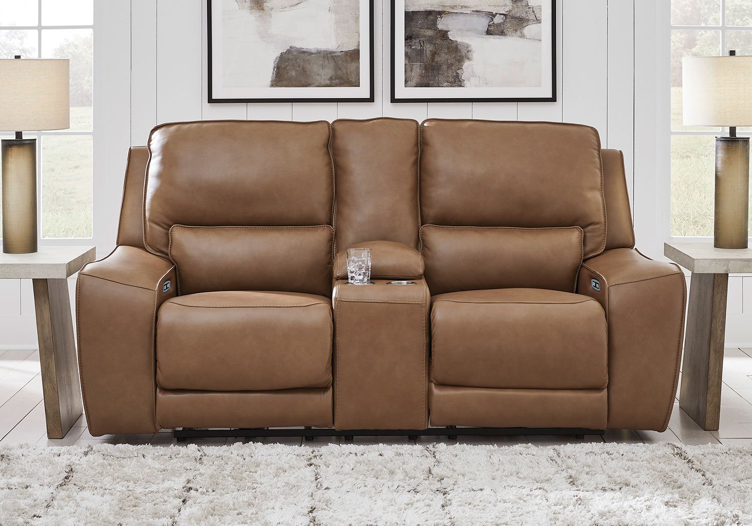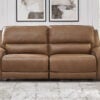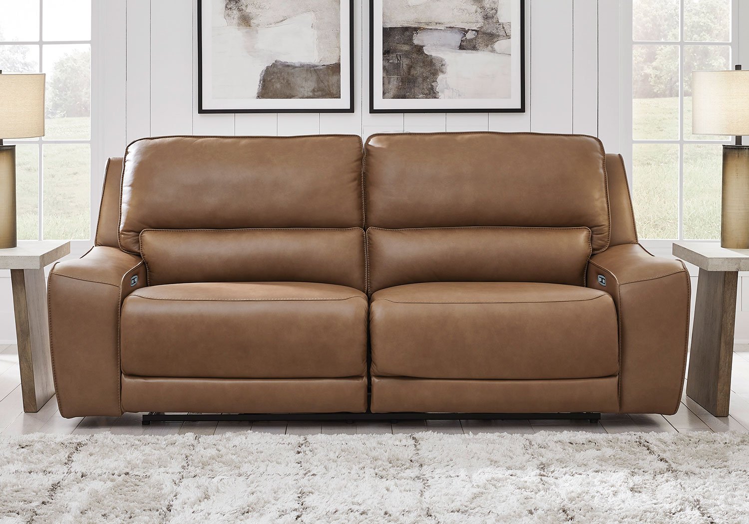 Live and lounge luxuriously. This power reclining sofa brings an ultra-stylish flair to your home’s central hub. Its seating area is wrapped in top-grain leather in a rich caramel coloration, giving you a trend-right look made all the better with high-quality materials. And with the simple push of a button, you can recline or adjust the headrests to find your ideal comfort position.